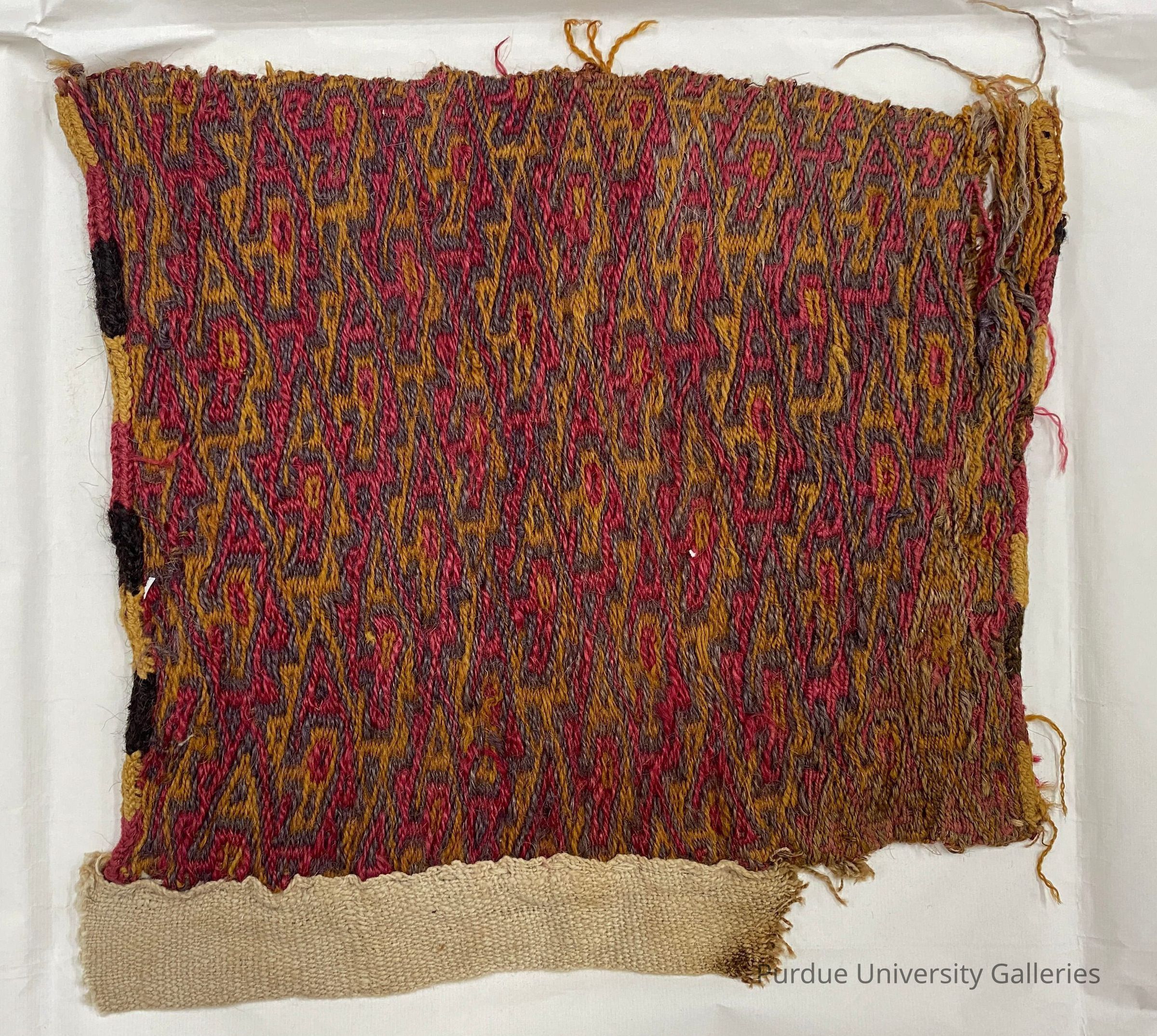 Textile panel in multi-weft technique with stylized bird motifs in red, yellow, blue, and black. There are two selvages finished in embroidery and part of cotton strap on one selvage.Acquisition