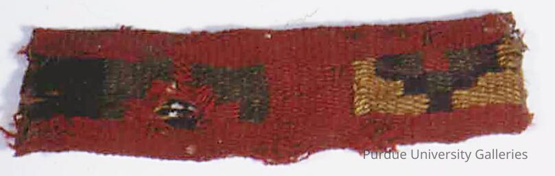 Textile fragment in tubular weave with warp-face pick up and warp floats on the inside of the tube. Red, green, yellow, and black.Acquisition