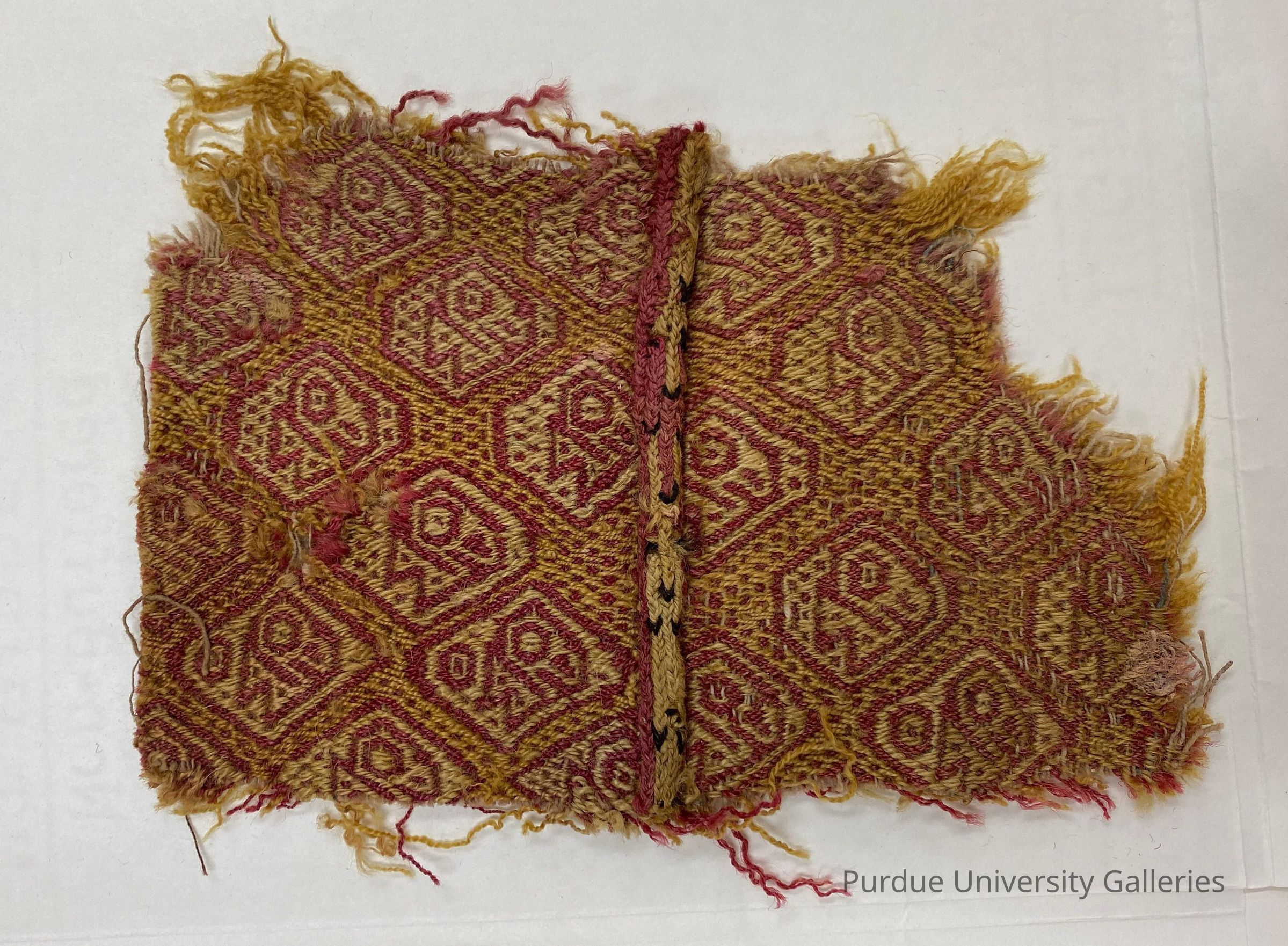 Textile fragment, possibly from bag, in multi-weft technique, with bird motifs and an embroidered border. Red, gold, and cream.Acquisition