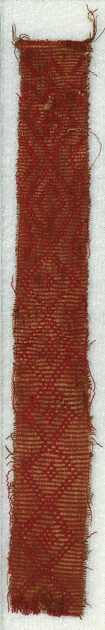 Textile fragment in warp-face pick-up. Diamond-shaped patterns in red and white.
