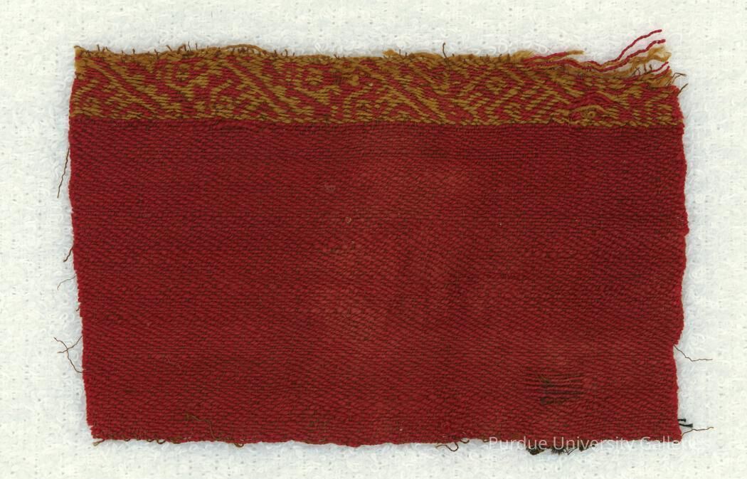 Textile fragment in warp-face pick-up with stylized bird motifs in red and yellow.