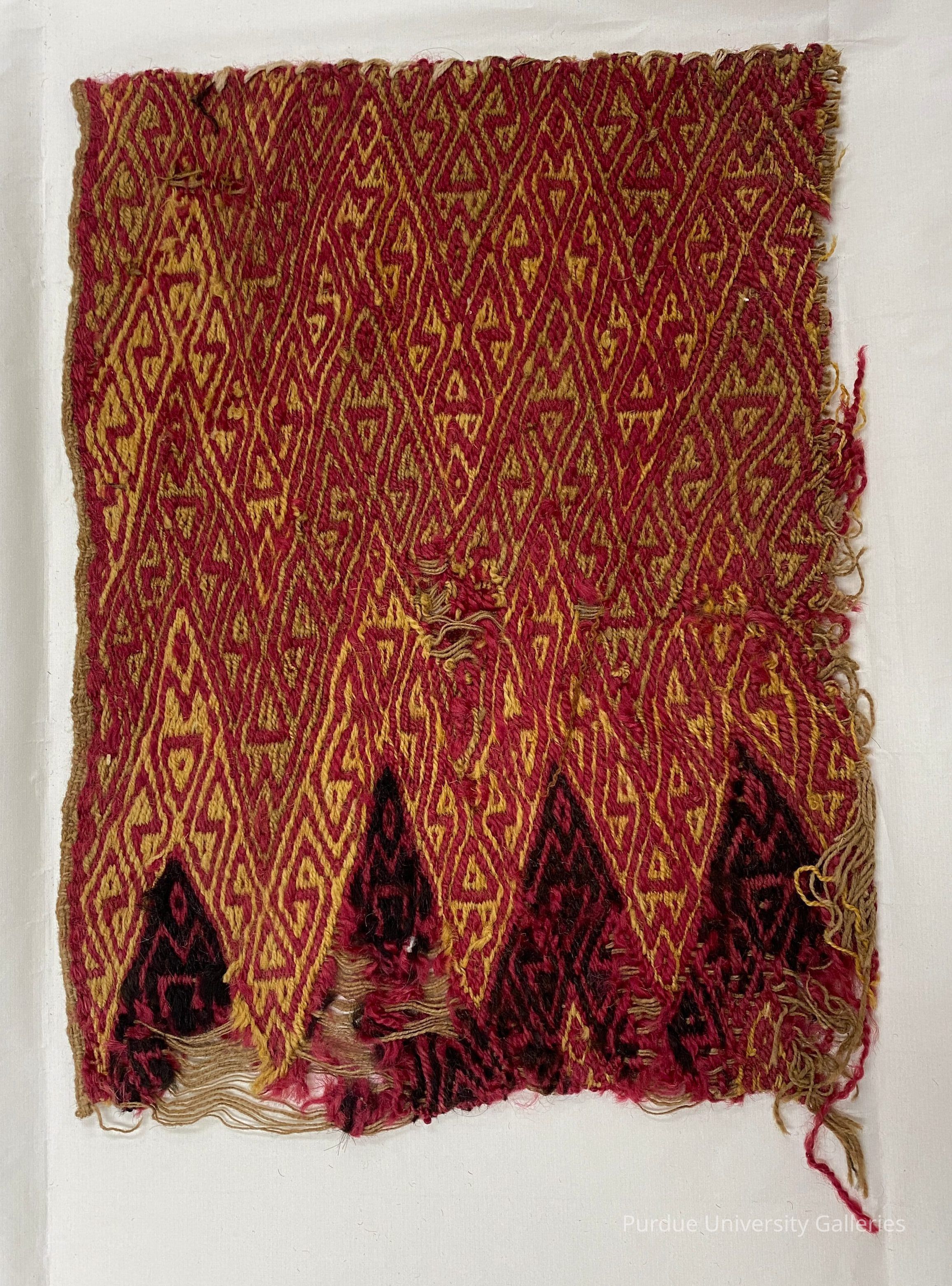 Textile fragment in multi-weft technique with stylized bird patterning in red, yellow, olive, and black.Acquisition