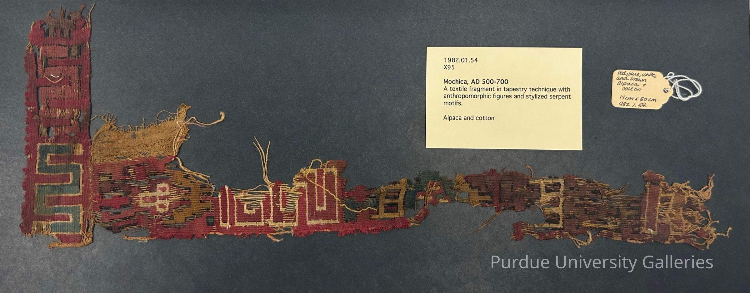Textile fragment in tapestry technique with anthropomorphic figures and stylized serpent motifs in red, blue, white, and brown.Acquisition