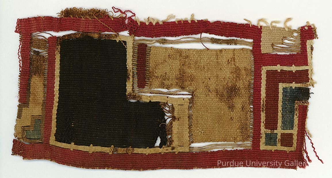 Textile fragment in tapestry technique, with wave motifs, in black, white, red, cream, and blue.Acquisition