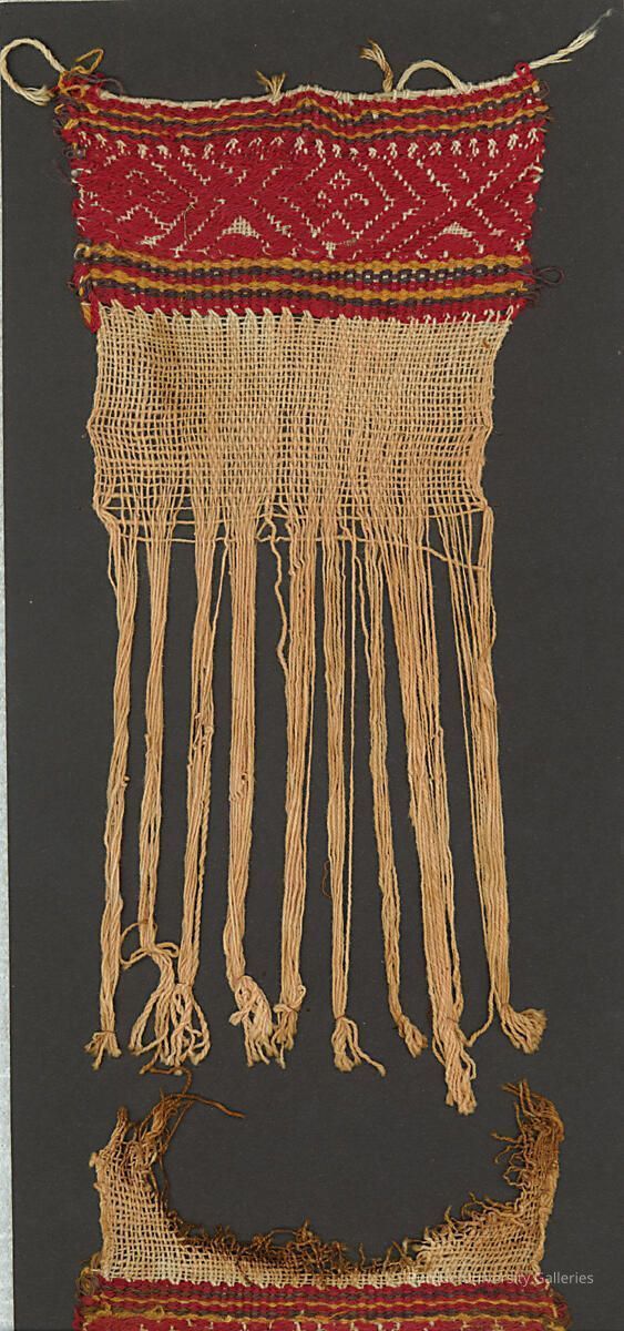 Loom fragment consisting of two pieces, presumably from the same loom. Plain weave cotton and alpaca brocade in stylized cats' head motifs.Acquisition