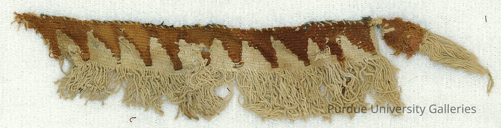 Border fragment with weft fringe, triangle motifs in brown and white, and one tassel.Acquisition
