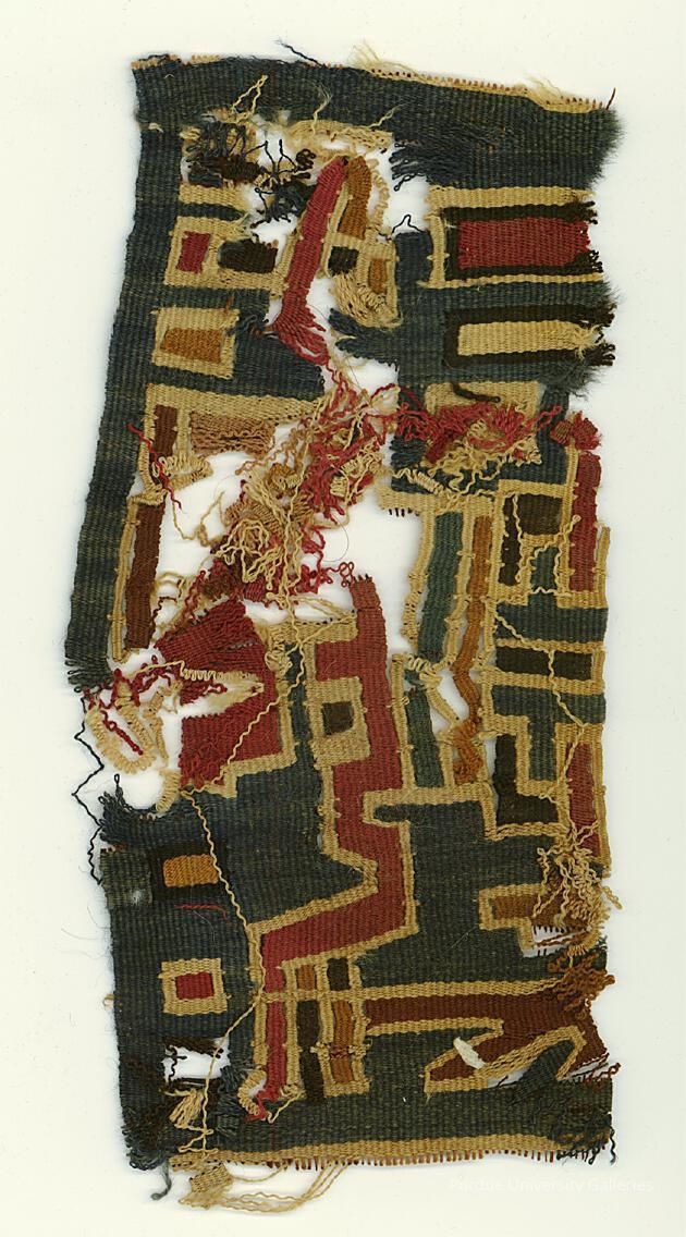 Textile fragment in tapestry with warrior motifs in blue, red, brown, gold, and cream.Acquisition