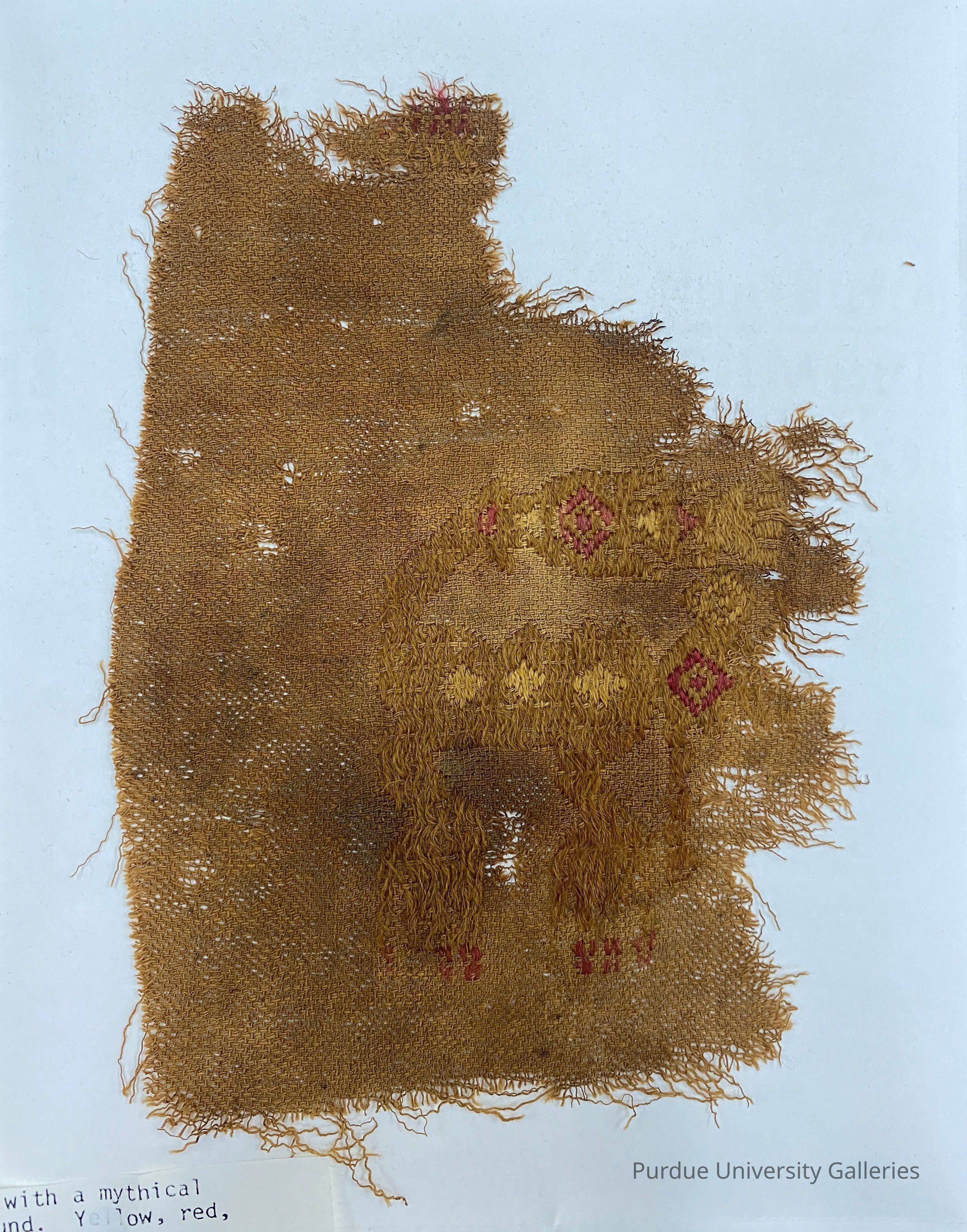 Textile fragment with mythical animal figure brocaded on brown cotton background. Yellow, red, and brown alpaca wool and cotton.Acquisition