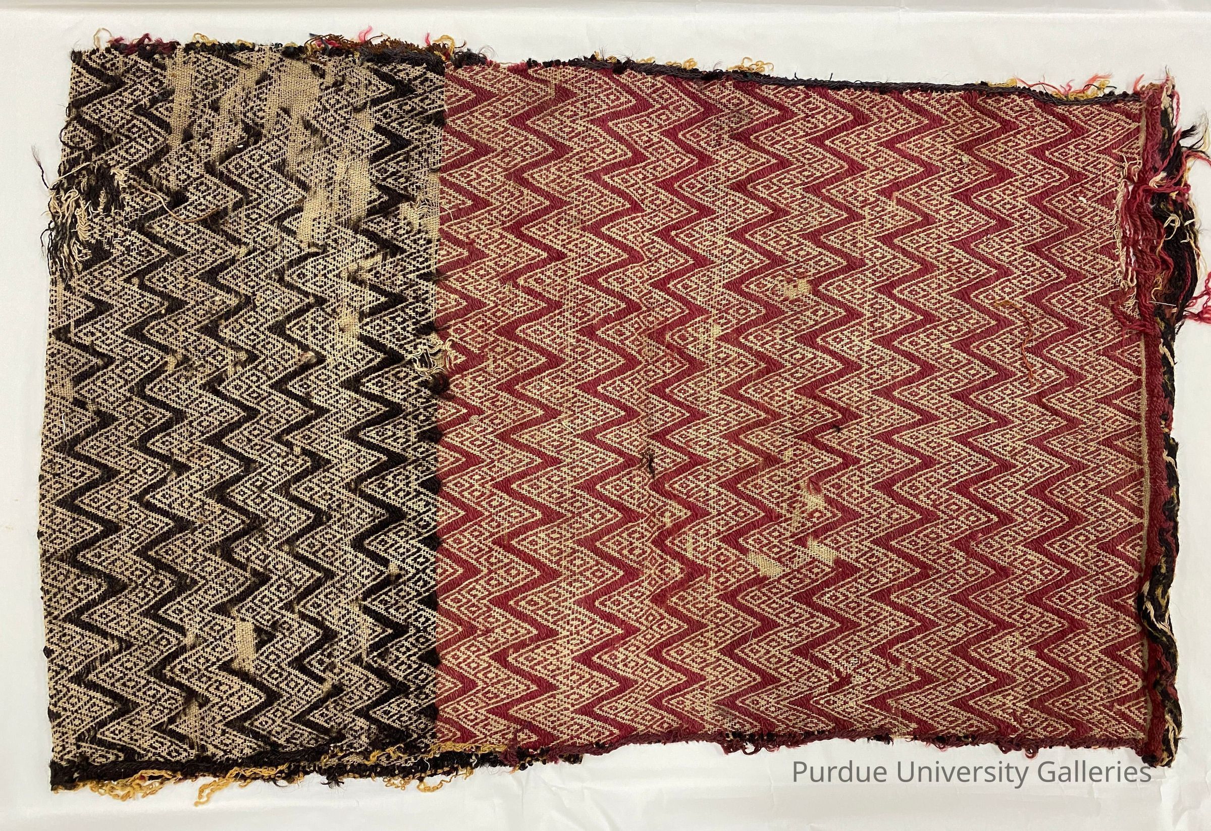 Textile panel with brocaded chevron designs in red and black on brown ground. The two selvages are tubular woven; there are remnants of other panels attached to two other selvages.Acquisition