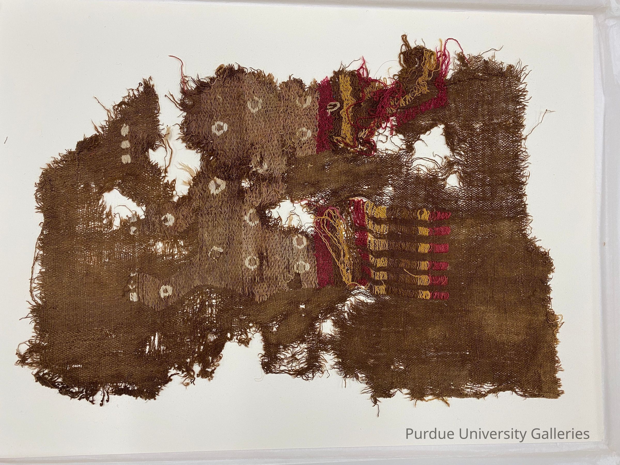 Textile fragment in weft brocade technique and showing portion of mythological creature. Red, yellow, green, and white, on brown ground.Acquisition