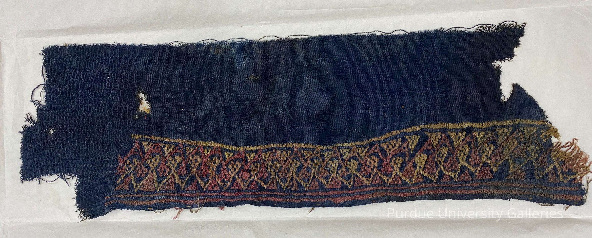 Textile fragment with a border embroidered in cats' heads motifs. Red, yellow, and blue.Acquisition