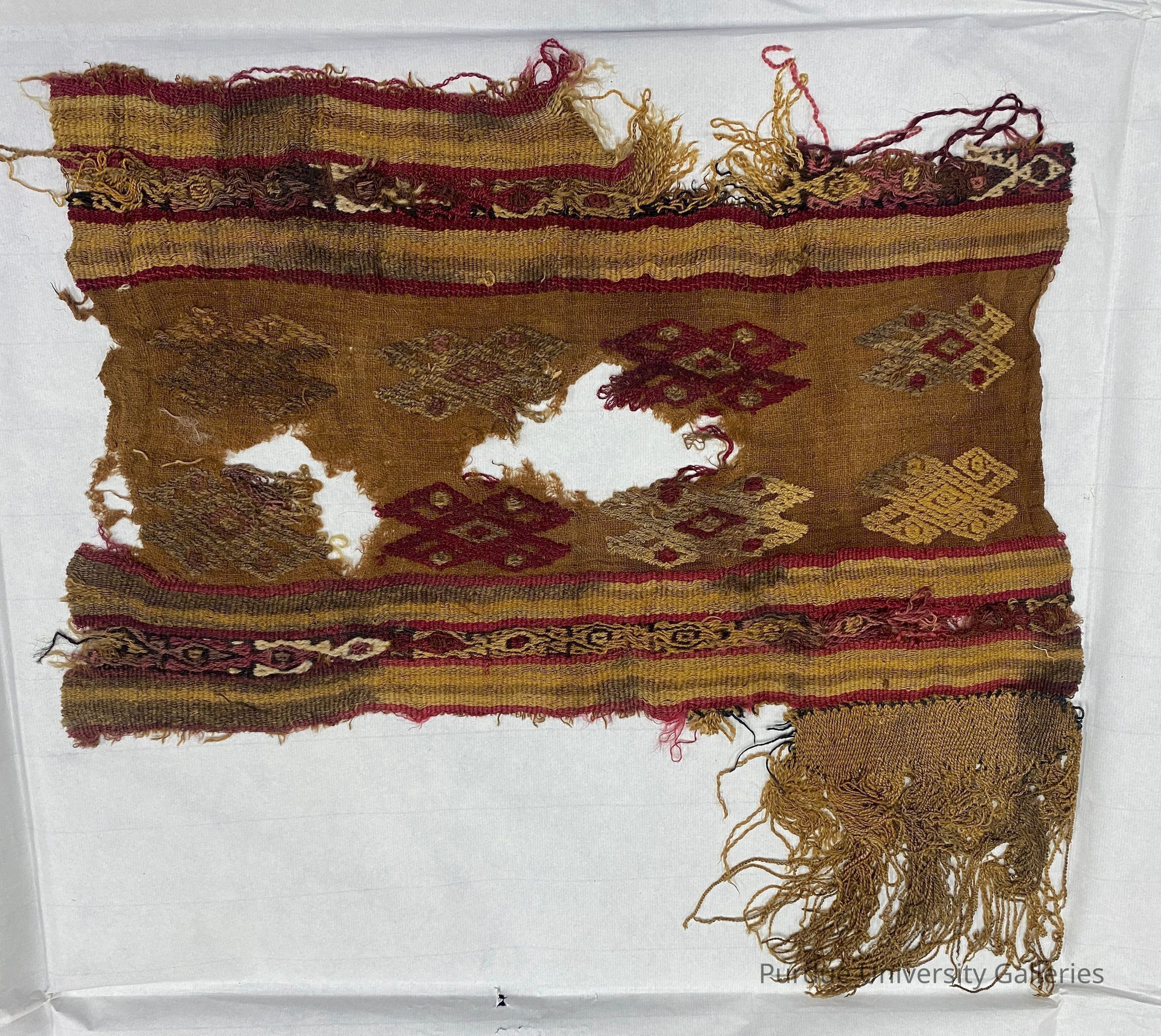 Textile fragment in brocade motifs of stylized birds; attached fringe. Red, pink, yellow, and brown. Woven alpaca wool and cotton.Acquisition
