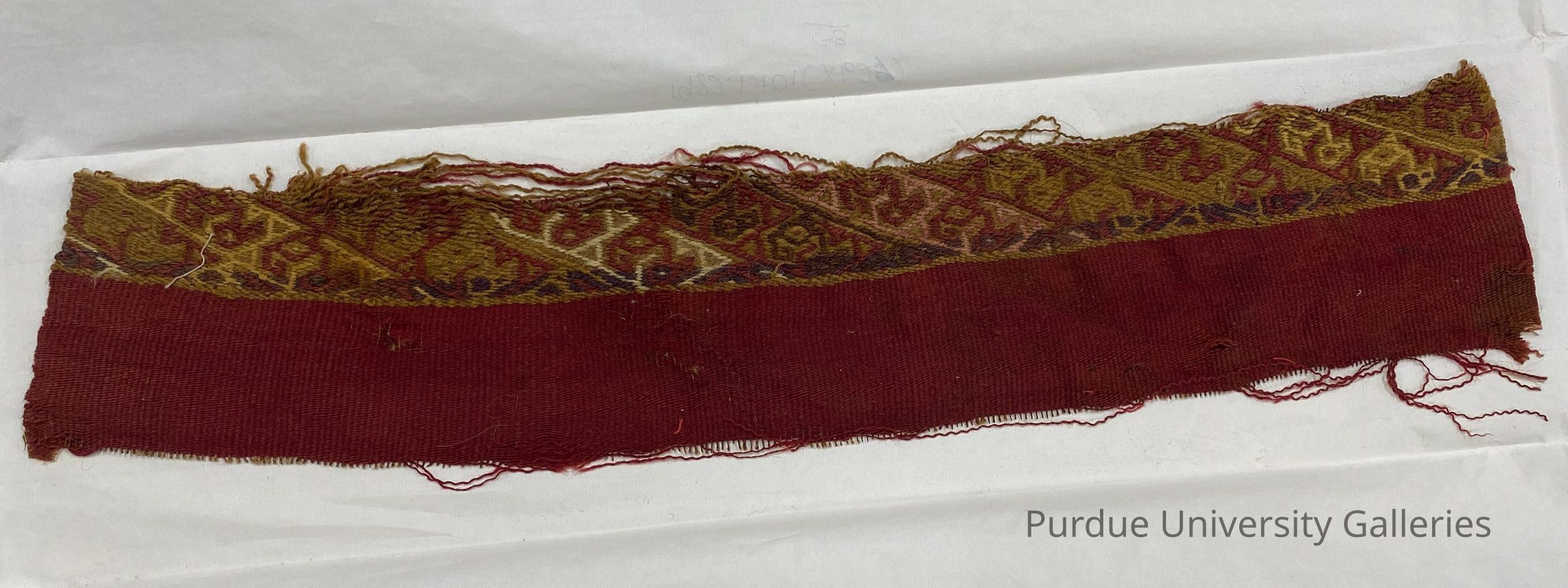 Textile fragment in multi-weft technique, with bird motifs in red, pink, purple, white, yellow, and tan.Acquisition