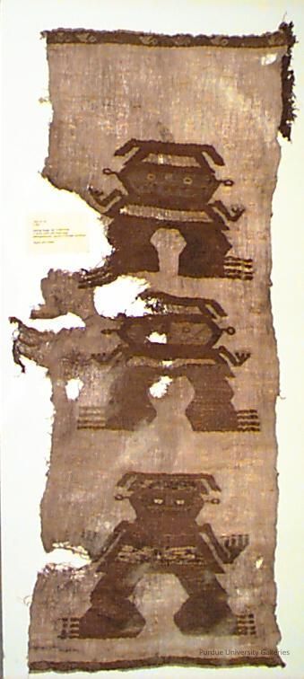 Fibre, alpaca and cotton.Textile panel with three large anthropomorphic figures in supplementary weft technique. Off-white and brown (trace of red).Acquisition