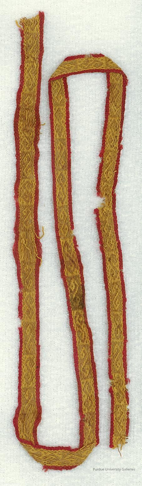 Band in warp-faced pick-up technique; serpent motifs in gold and olive with red borders.