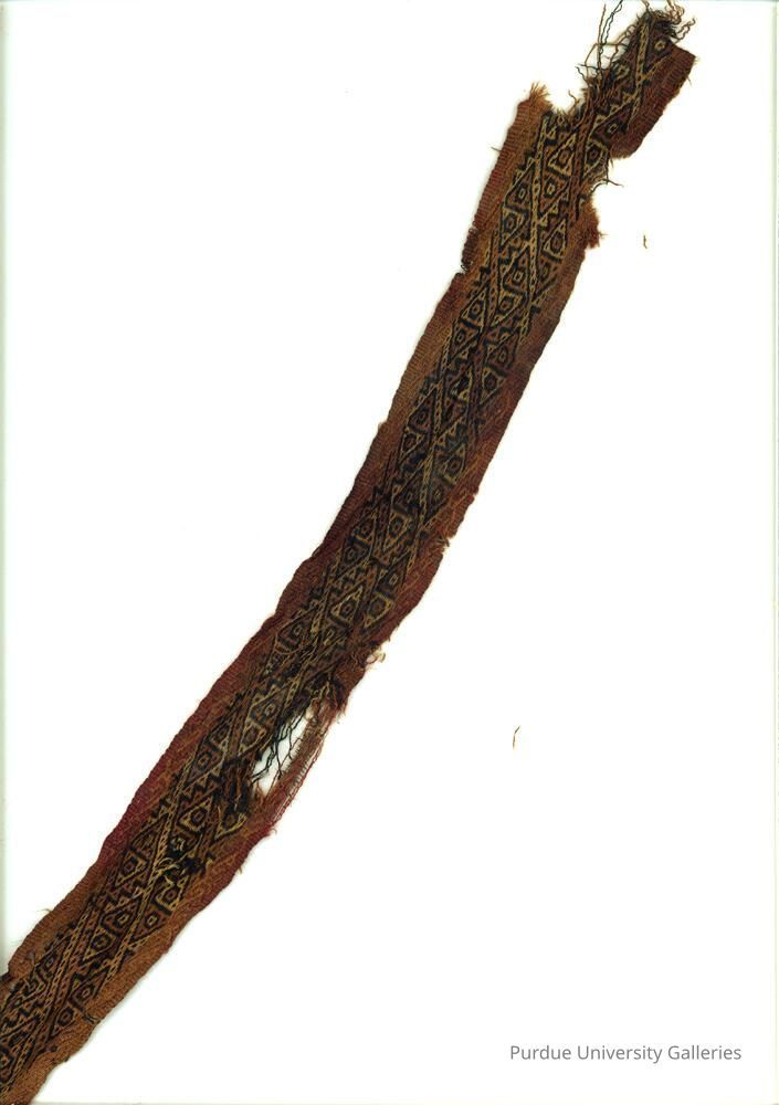 Fragment of band with stylized bird motifs in a warp-face pick-up technique, in brown, black, yellow, and tan.Acquisition