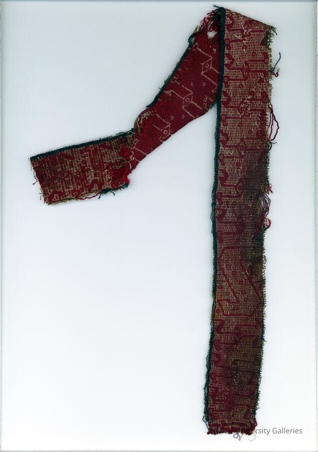 Band in warp-face pick-up technique with double-headed snake motifs. Red, white, and blue.Acquisition