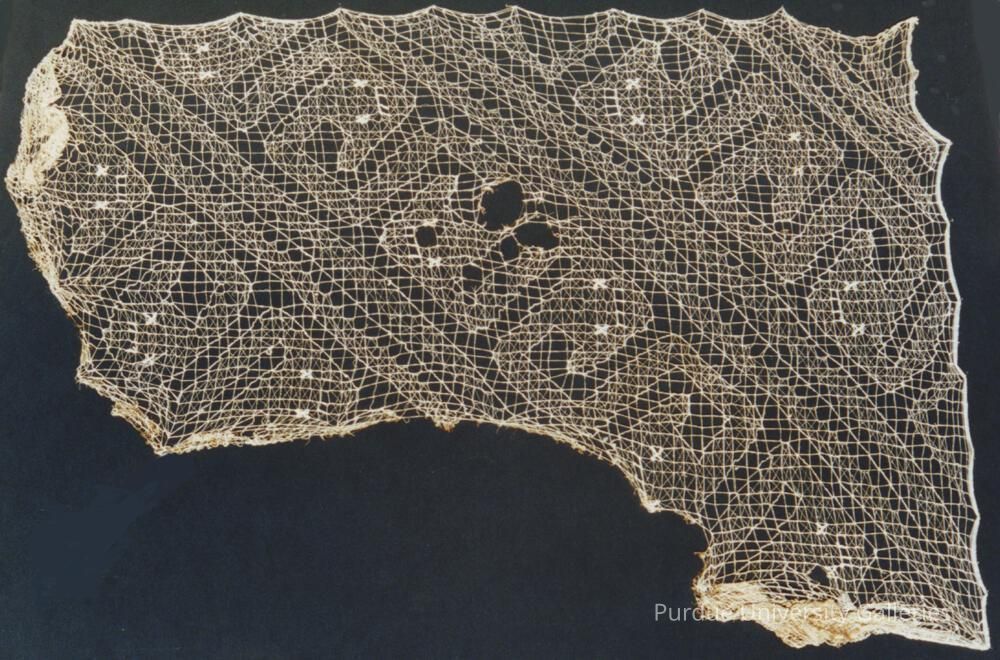 Gauze fragment, knotted netting with embroidery highlighting serpent motifs, white.Acquisition
