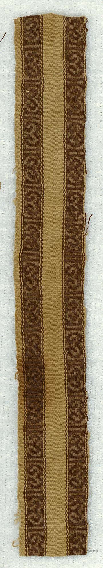 Textile fragment in warp-face pick-up technique with geometric motifs in brown, gray, and tan.Acquisition