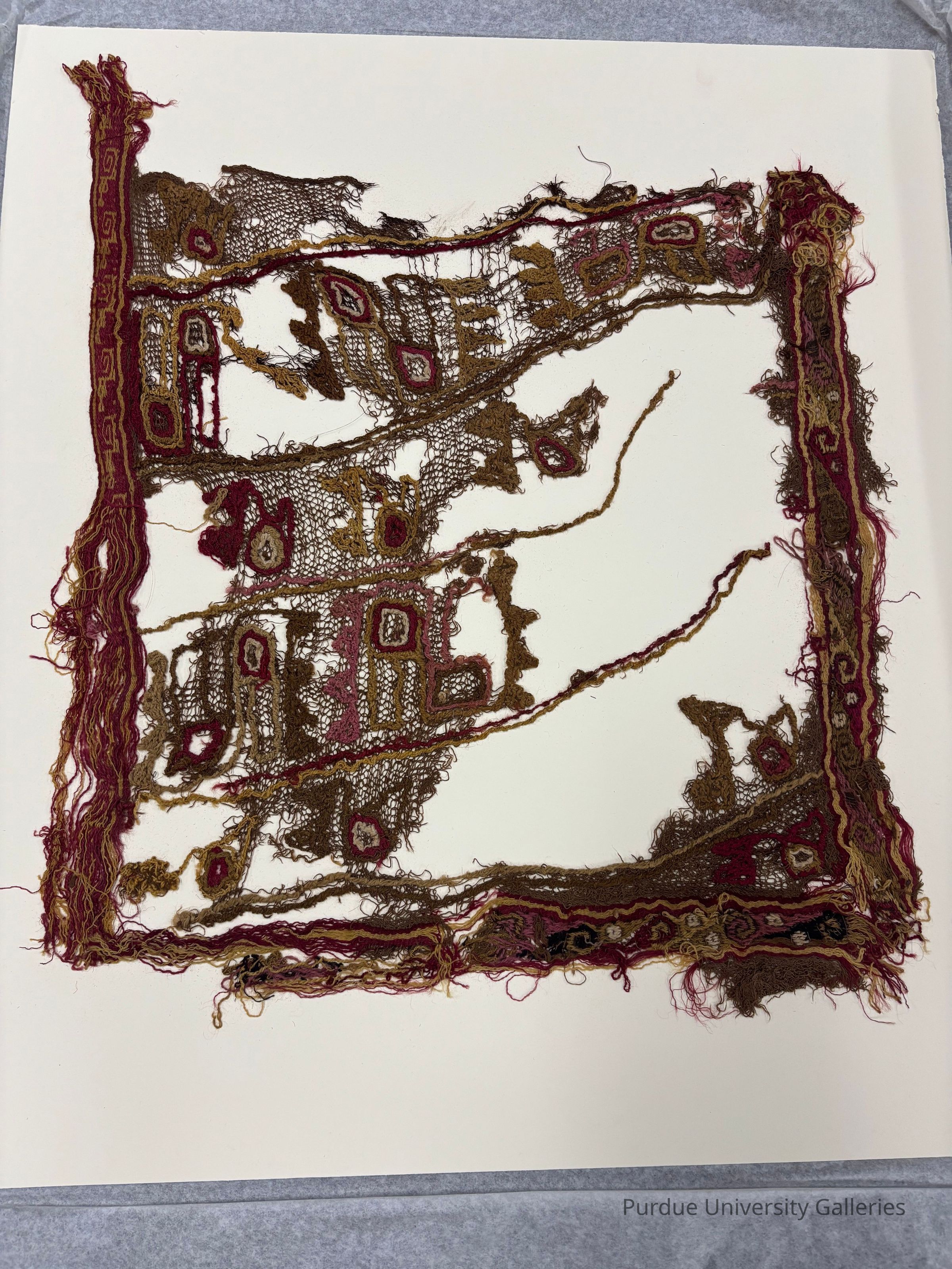 Textile fragment, with bird motifs in red, pink, yellow, white, and browns, embroidered on brown cotton gauze ground. Supplementary weft border.Acquisition