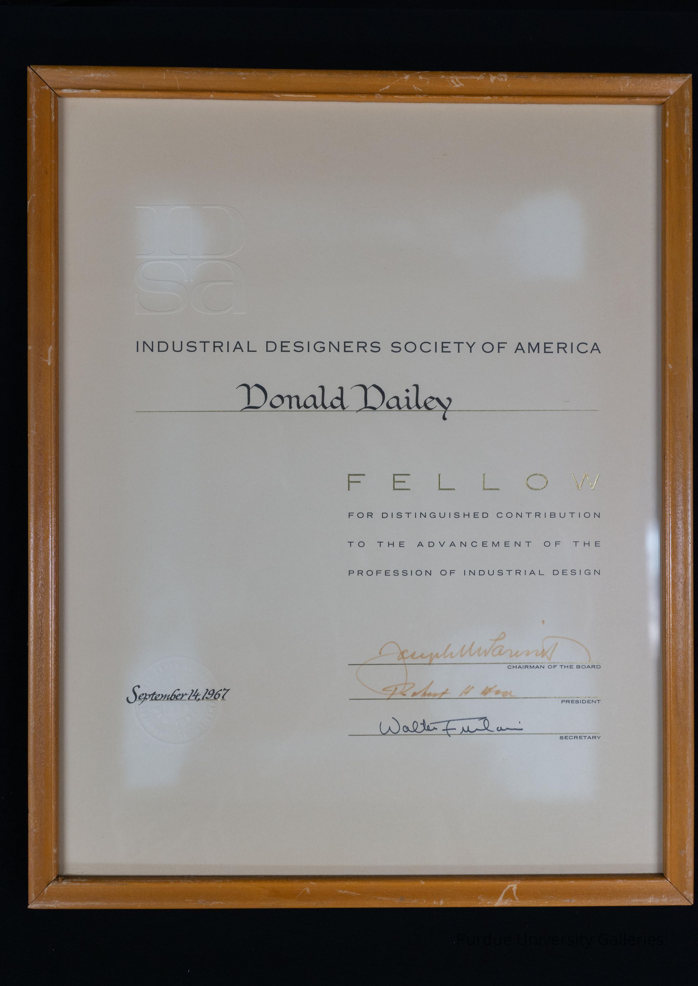 Framed in light-colored wood. It was given to Donald Dailey by the "INDUSTRIAL DESIGNERS SOCIETY OF AMERICA" as he was given the title "FELLOW" "FOR DISTINGUISHED CONTRIBUTION TO THE ADVANCEMENT OF THE PROFESSION OF INDUSTRIAL DESIGN". It was signed by the chairman of the board, the prpesident, and the secretary.Collection