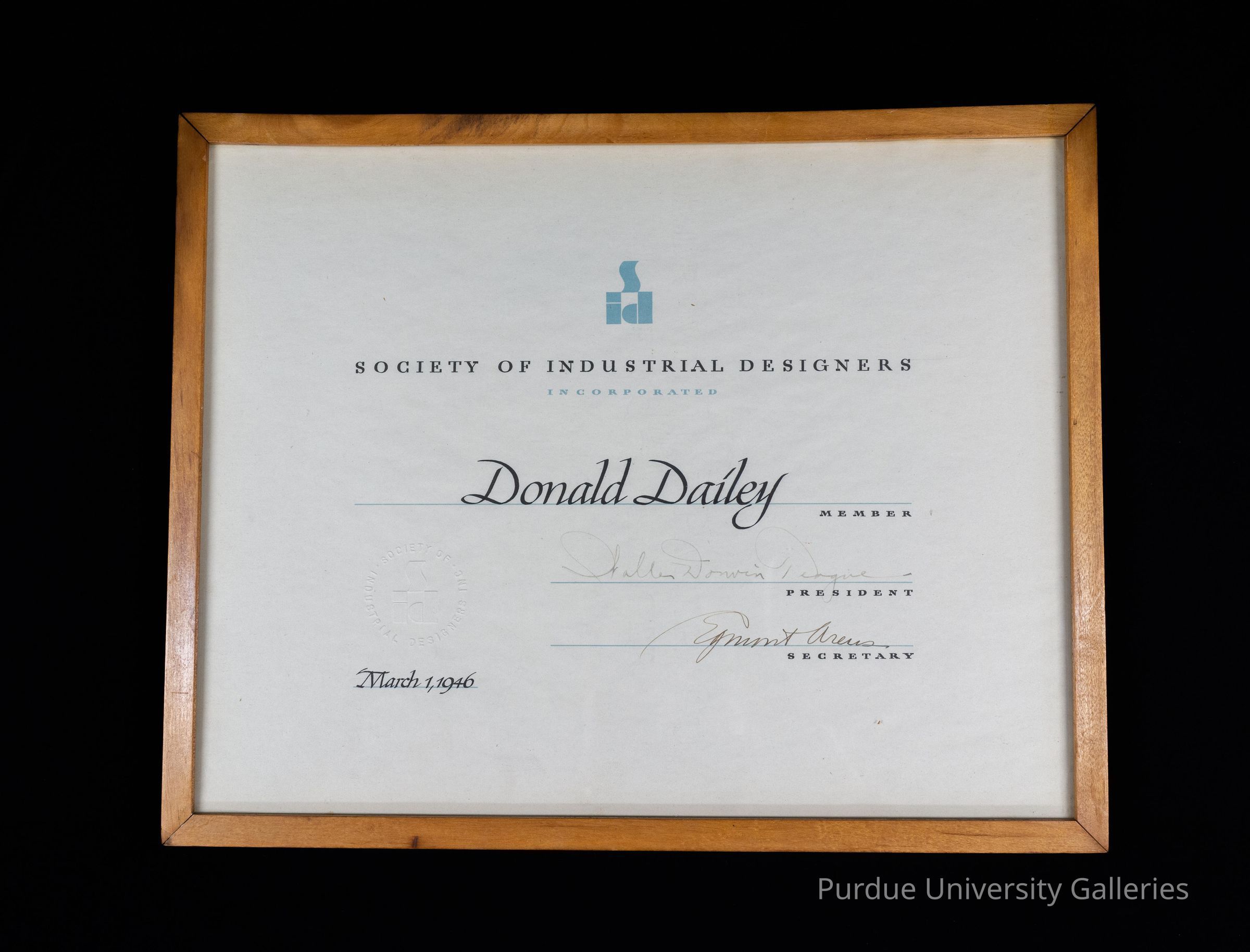 Framed in light-colored wood from "SOCIETY OF INDUSTRIAL DESIGNERS" "INCORPORATED" for "MEMBER" Donald Dailey, signed by the president and secretary of the society.