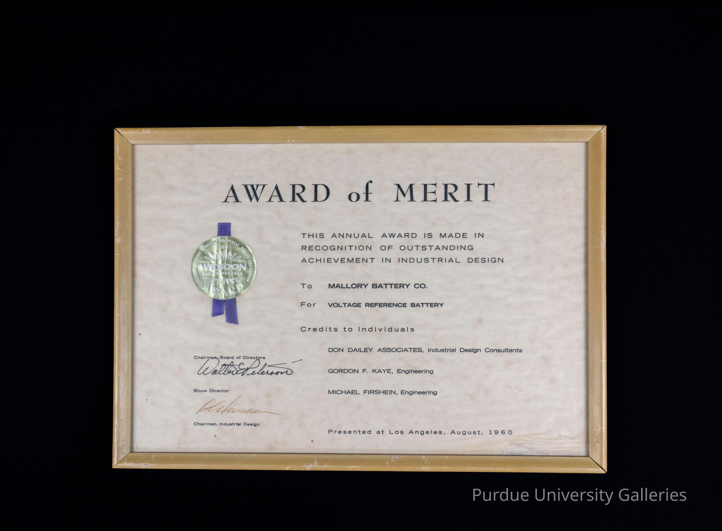 Framed in light-colored wood. An "AWARD OF MERIT" from the "WESCON DESIGN PROGRAM" "SECOND ANNUAL WESCON INDUSTRIAL DESIGN EXHIBITION". It says "THIS ANNUAL AWARD IS MADE IN RECOGNITION OF OUTSTANDING ACHIEVEMENT IN INDUSTRIAL DESIGN" "To MALLORY BATERY CO." "For VOLTAGE REFERENCE BATTERY". It was signed by the Show Director and the Chairman, Industrial Design. "Credits to Individuals" goes to "DON DAILEY ASSOCIATES, Industrial Design Consultants", "GORDON F. KAYE, Engineering", and "MICHAEL FIRSHEIN, Engineering". "Presented at Los Angeles, August, 1960"Collection