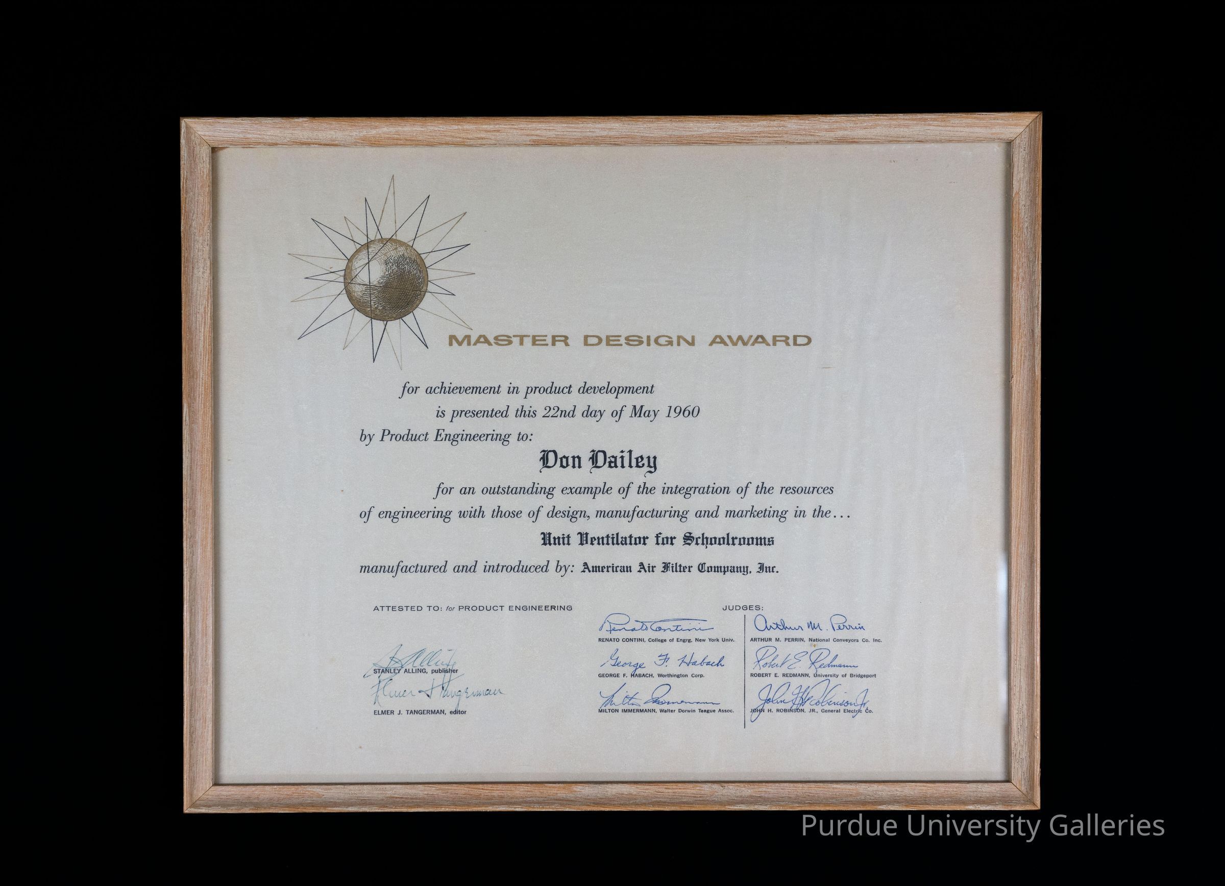Framed in light-colored wood. A "MASTER DESIGN AWARD" "for achievement in product development" "is presented this 22nd day of May 1960" "by Product Engineering to:" "Don Dailey" "for an outstanding example of the integration of the resources" "of engineering with those of design, manufacturing and marketing in the..." "Unit Ventilator for Schoolrooms" "manufactured and introduced by: American Air Filter Company, Inc."Collection