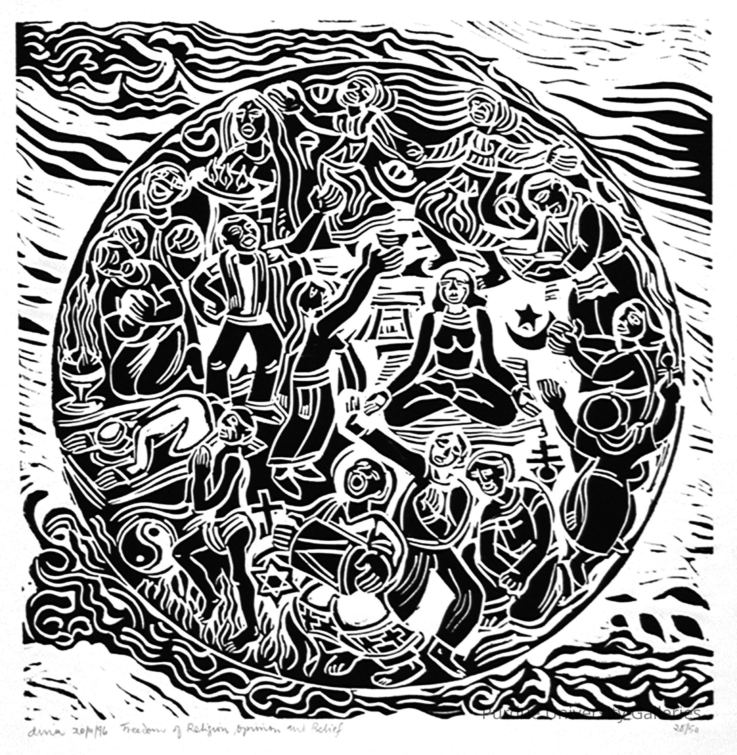 "(The Right to…) FREEDOM OF RELIGION, BELIEF AND OPINION Dina Cormick Durban/KwaZulu-Natal linocut “…the right to freedom of conscience, religion, thought, belief and opinion.” "