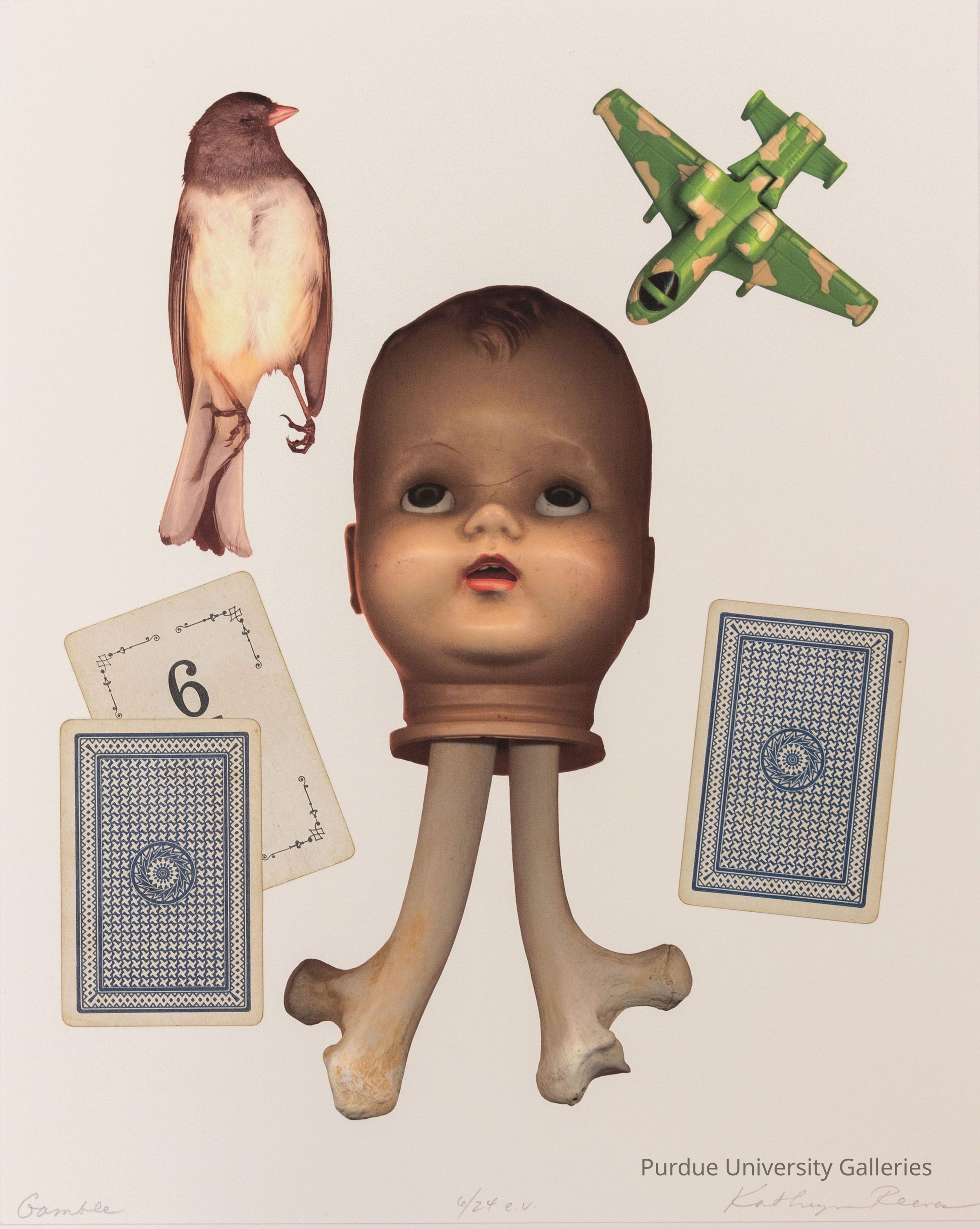 Images of a baby-doll head with 2 bones sticking out of the neck, a bird, and a toy airplane. Flanking the baby-doll head are 3 playing cards which are afixed to the paper with an adhesive. The cards are blue and white with one card face up and the number "6" on it. Along the bottom fo the paper in pencil "Gamble, 6/24, Kathryn Reeves"Acquisition