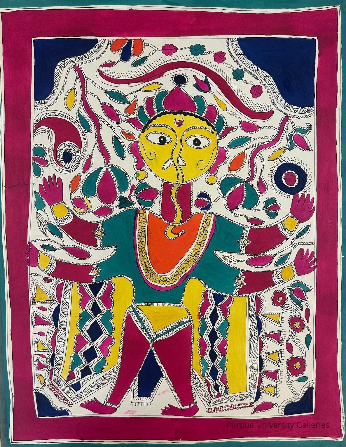 The central figure is adorned with vibrant red, yellow, and green colors, intricate patterns, and traditional attire. Surrounding the figure is a backdrop of stylized leaves and floral motifs. The figure is shown with his multiple arms raised in a gesture, with a large crown atop their head.Type of Painting