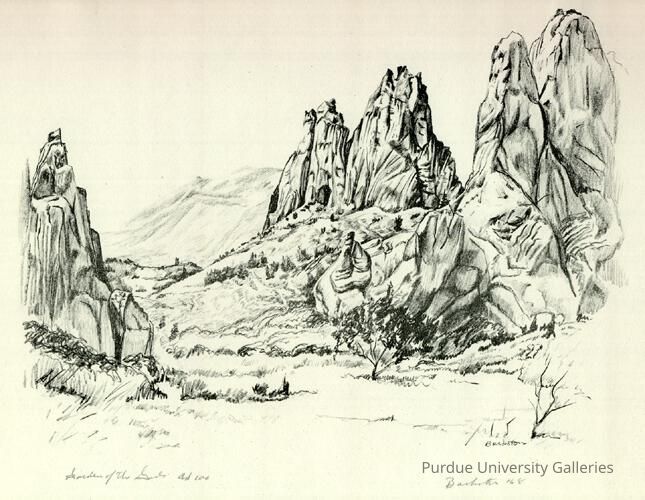 Backston’s Garden of the Gods wonderfully represents the lush landscape forming the garden. The image shows five tall rocky peaks and a broader mountain in the background. There are a few small trees and other shrubbery in front of the peaks. The artist used dark lines in the foreground and very subtle light lines in the background to indicate distance and atmospheric perspective. Backston’s varied use of line work makes for a dynamic composition, and one also sees his skillful use of negative space in the upper left part of the composition. It offers a resting point for the eye when exploring this beautiful landscape.