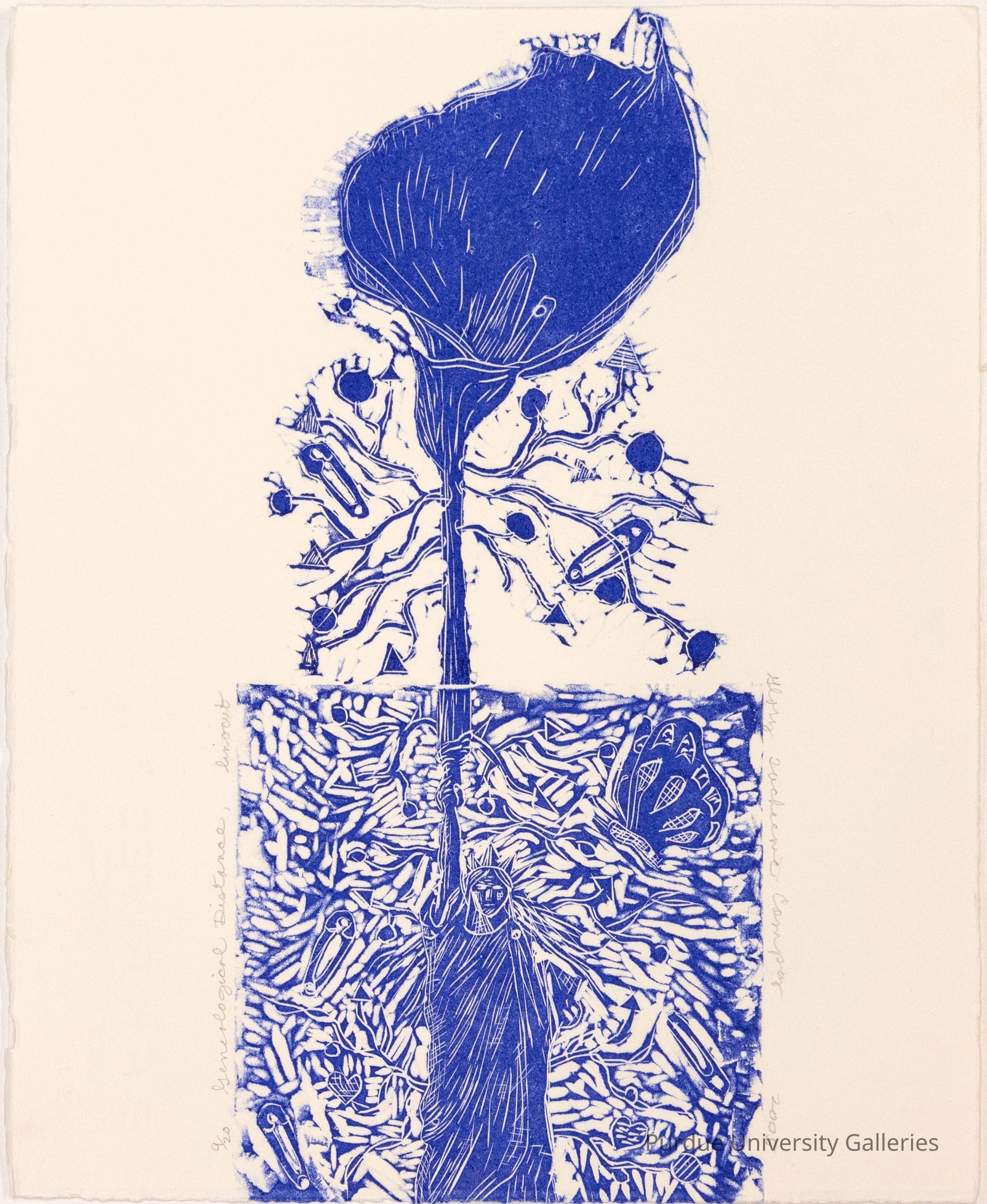 Along the left edge of the area surrounding the Statue of Libery written in pencil "9/20 Geneological Disantance, linocut." On the right side of the same area written in pencil, "Glory Tachinee Compoy, 2005"Type of Print