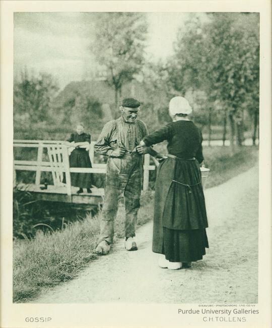 The image captures two people talking with each other as a woman watches in the back. A man's face is visible to the camera as he talks to the woman; he holds onto his trouser with bulky shoes on and a hat. The woman's back is turned towards the camera but she also wears bulky shoes, a dress, apron, and white hat. The two are focused on each other as they talk on the gravel road; the camera uses as a wide aperture, as the woman in the background is blurred. The woman in the background stands on a small bridge as she watches the two people talk, she also wears a dress.Photograph Details
