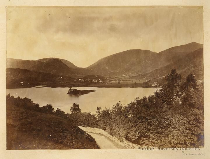 A landscape view of Grasmere lake in the Lake District in England. There is a little island in the middle of the land. Mountains surround the lake in the background and a narrow trail/road leads the viewers from the bottom of the print to the inside.Photograph Details