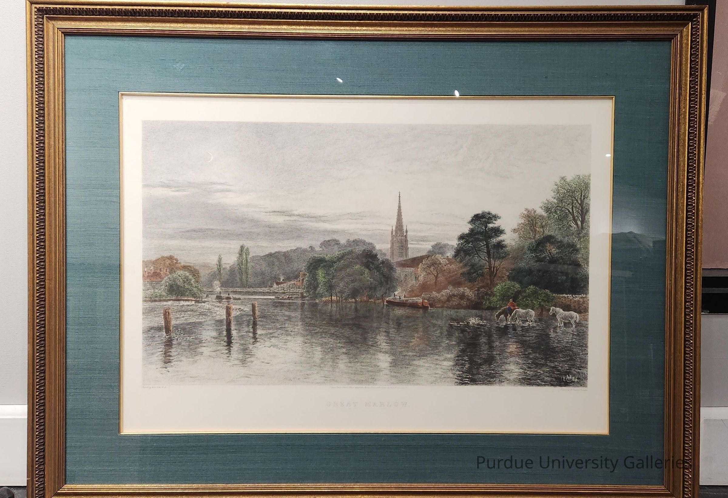 Landscape of a church behind the River Thames; lower left corner - Vicat Cole, lower right corner - A. Brunet Debaines