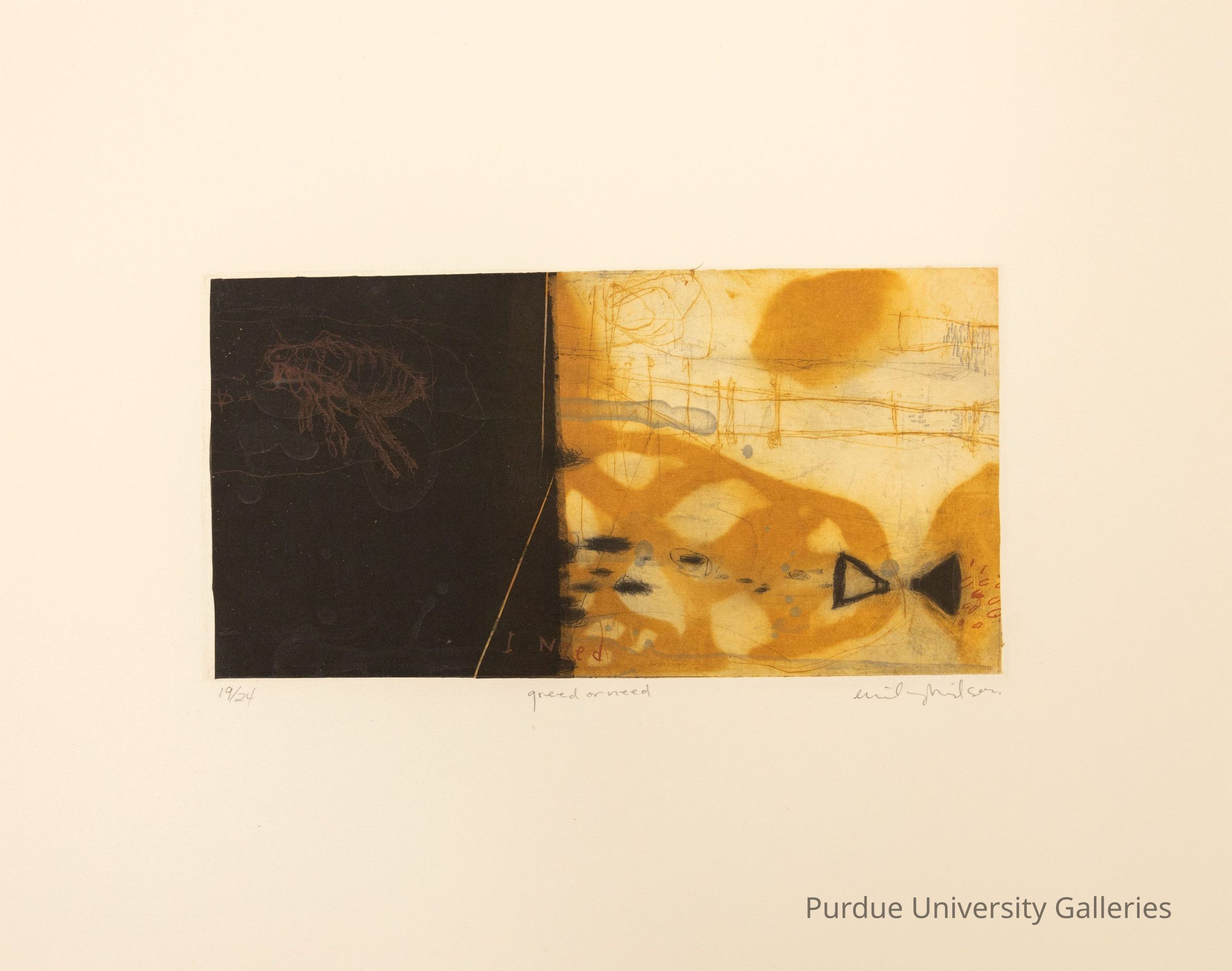 Print with 1/3 left side dark and the 2/3 right side yellow and black. On the black side is the faint outline of an insect in the upper half with "I Ne" along the bottom where the two sides intersect. On the right side "ed" continues the the sentence. Under the print written in pencil is "19/24, greed or need, artist's signature (illegible)."Collection