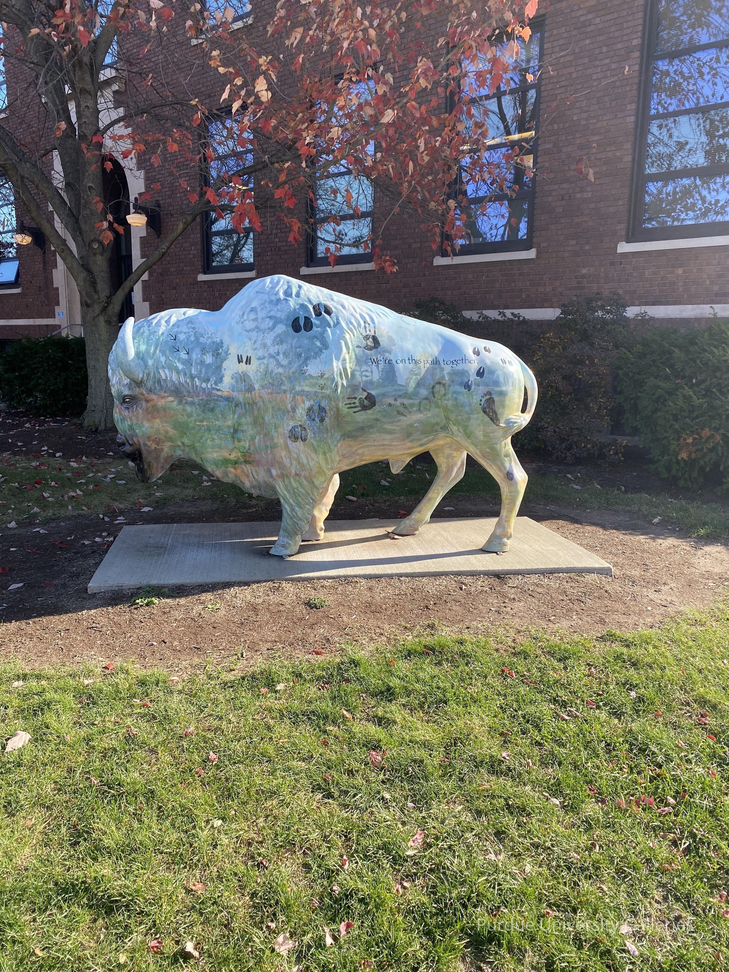 bison sculpture with faded images of landscapes and animal footprints on it. it has the words "Protecting, Conserving, Promoting & Advancing" and "We're on this path together" on its sides.Type of Sculpture