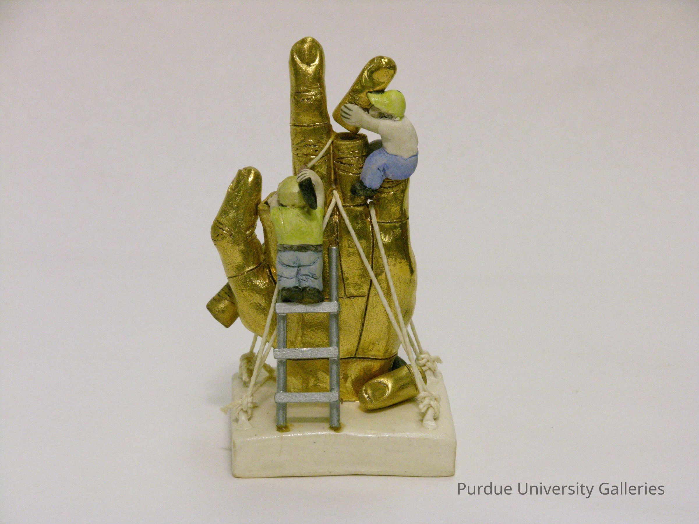 This ceramic sculpture depicts a scene of these miniature people hand building a hand. The hand itself is meticulously crafted showing the pieces where the original ceramicist carved to make it look like the mini people put the pieces together. It has a gold glaze and creases and carved and in the crevices there seem to be darker bits of the glaze. Two of the miniature people have blond hair and one has red hair. They are building the hand themselves. One has a hammer and the other is mounting a finger on. One is climbing the hand the other stands on a step ladder. The hand is being held down by strings and rope on a block base.Type of Sculpture