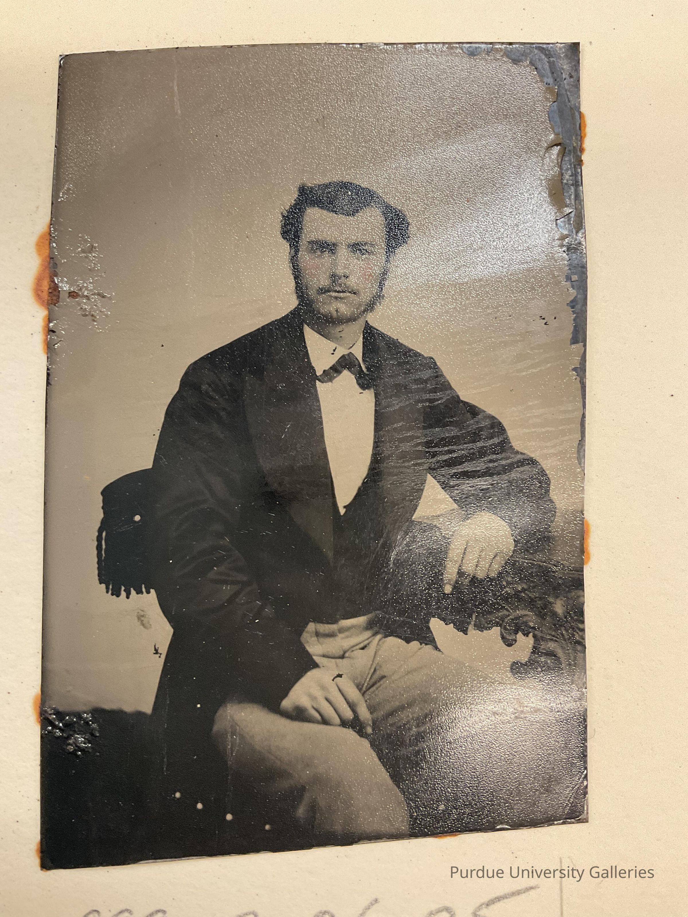 Tintype of man sitting on a chair with his left elbow on a table. He has a mustache and sideburns, is wearing a cravat, a dark frock coat and waistcoat, with light trousers.