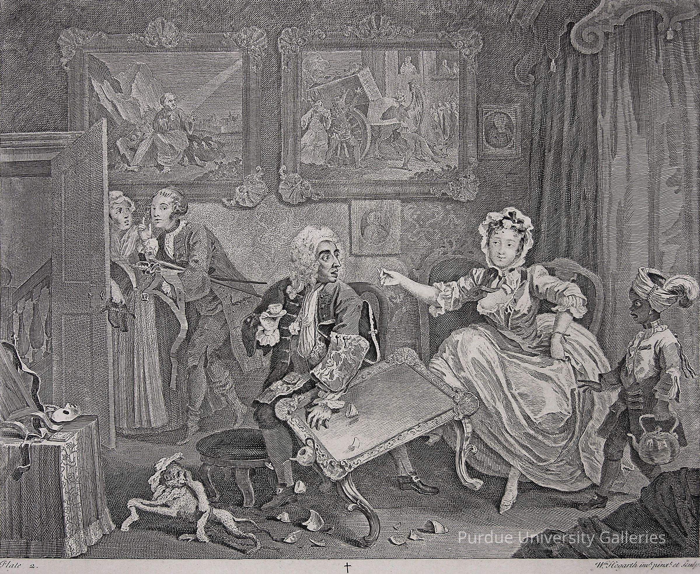 Her apartment is richly appointed. She keeps a maid (dressed much as she herself was in Plate I), an exotic West Indian servant boy and a monkey. The monkey, the most pointed indication of her affectation, resembles the merchant in facial expression and posture, and there is little difference in her treatment of either plaything. Prominent on her dressing table is a mirror, symbol of vanity, beside it a jar of make-up and a smiling white mask. The mask, which is not unlike a death mask, suggests that Moll has been taken to a masquerade by her partially but fashionably dressed visitor, a fellow noticeably more youthful and attractive than the middle-aged businessman who supports her.