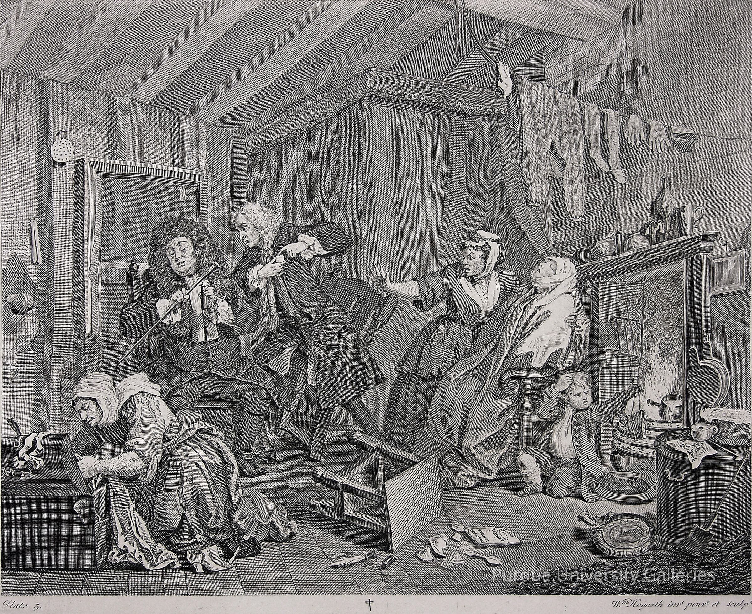 Nor are there any of the usual signs of liquor; all her money has been spent on quack cures for her disease. On the floor, by the overturned table, lies an advertisement for and anodyne (pain-killing) necklace purchased to cure her own or perhaps her son's congenital syphilis. The mantelpiece is lined with similarly useless prescriptions. By the pipe, spittoon and old punchbowl, lie Moll's teeth; loosened by the fruitless use of mercury as a cure of venereal disease, they have come out. Over the expiring figure of Moll hang the limp, ghostly forms of her laundry.”