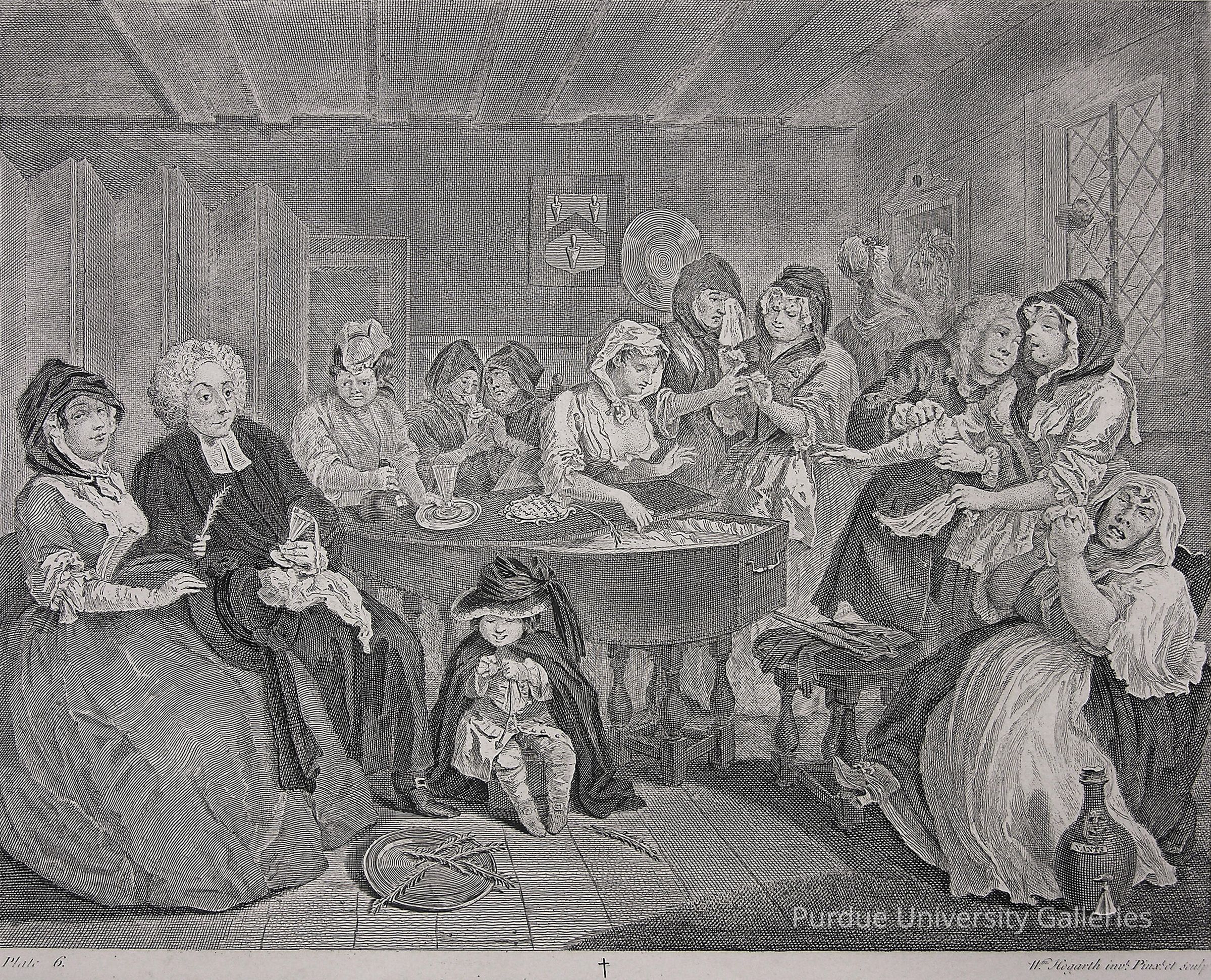 Before the coffin Moll's son, decked out grandly as the principal mourner, plays with his spinning top. At the right side of the scene an old woman, probably Moll's bawd, howls in a fit of tears inspired as much by the brandy bottle at her side as by considerations of financial loss. Behind the bawd, an undertaker over solicitously assists a girl with her glove; she postures as if in grief as she steals his handkerchief. At the mirror a girl adjusts her headgear vainly, oblivious to the prominent disease spot on her forehead. A weeping figure shows a disordered finger to a companion who seems more curious than sympathetic.