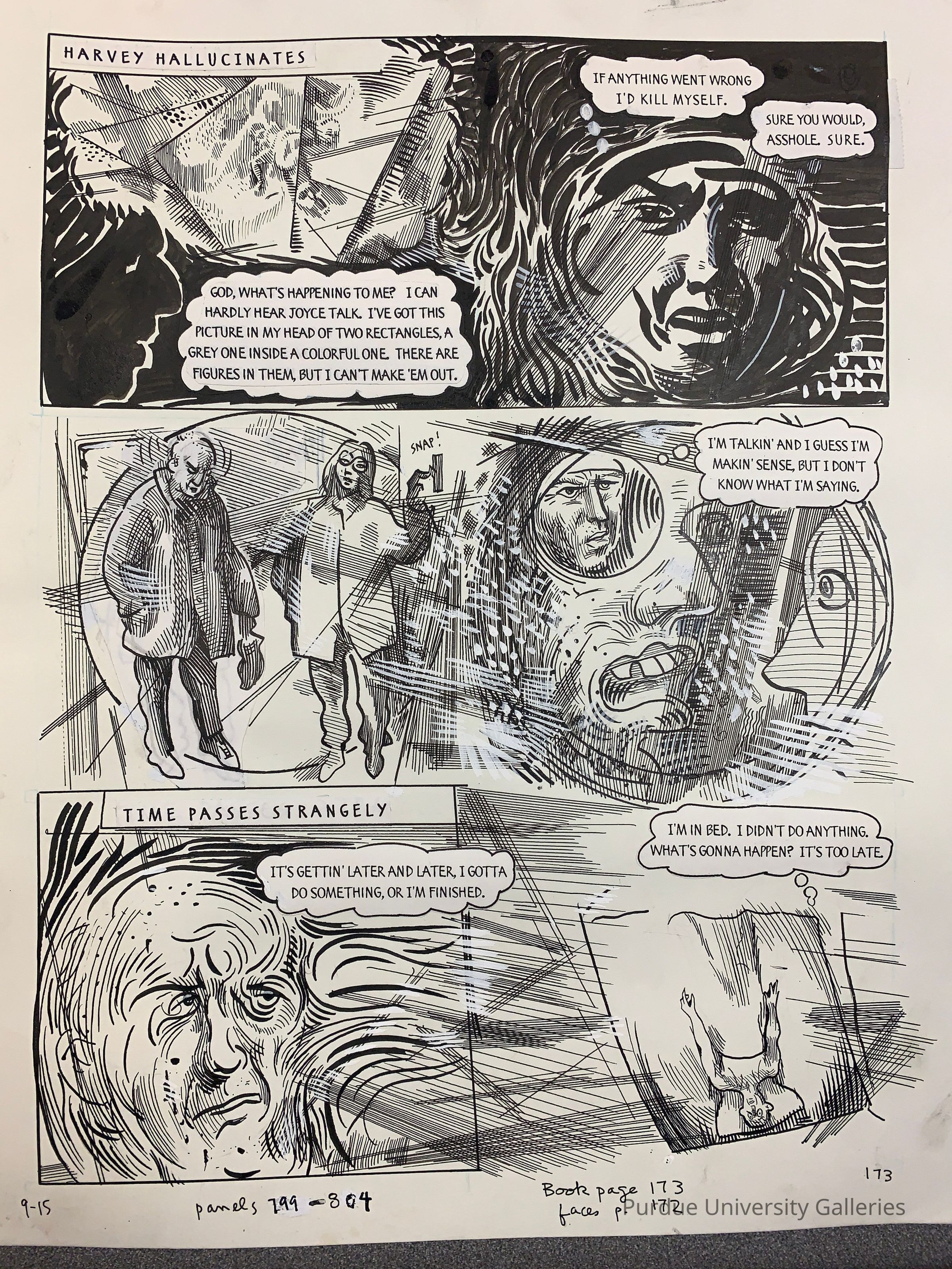 The piece is titled, "Our Cancer Year (Four Walls Eight Windows, 1994)" and it was written by Joyce Brabner and Harvey Pekar. This is a non-fiction comic that tells the story of Harvey overcoming cancer and his journey with his wife Joyce. Our Cancer Year was illustrated by Frank Stack (he also goes by Foolbert Sturgeon). Purdue owns 3 of the original sheets of this comic. In this piece it is the 2nd in date from the other 2 Purdue holds. This scene depicts a moment of Harvey's life where he is imagining his life flashing in his eyes in a pessimistic way. The marks are expressionistic in a way that adds dimension and emotional turmoil to the scene. He has a hard time hearing his wife due to his depressive and suicidal thoughts. As time passes, he begins to lose himself more to his cancer in mindset and body.Type of Print