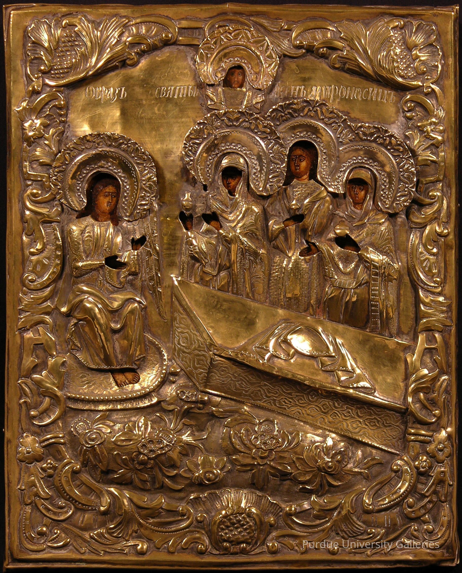 Tempera painting on curved wooden panel covered by silver-plated copper riza. The riza shows three women on the right and an angel seated on the left. The women stand aside a table with a burial shroud atop it, a cluster of flowers is etched below. The angel, each of the three women, and an image of God at the top are all surrounded by raised halos. Two Russian Cyrillic captions flank the figure of God. Despite the presence of a riza, this piece has no makers mark or other stylistic stamps.Type of Painting