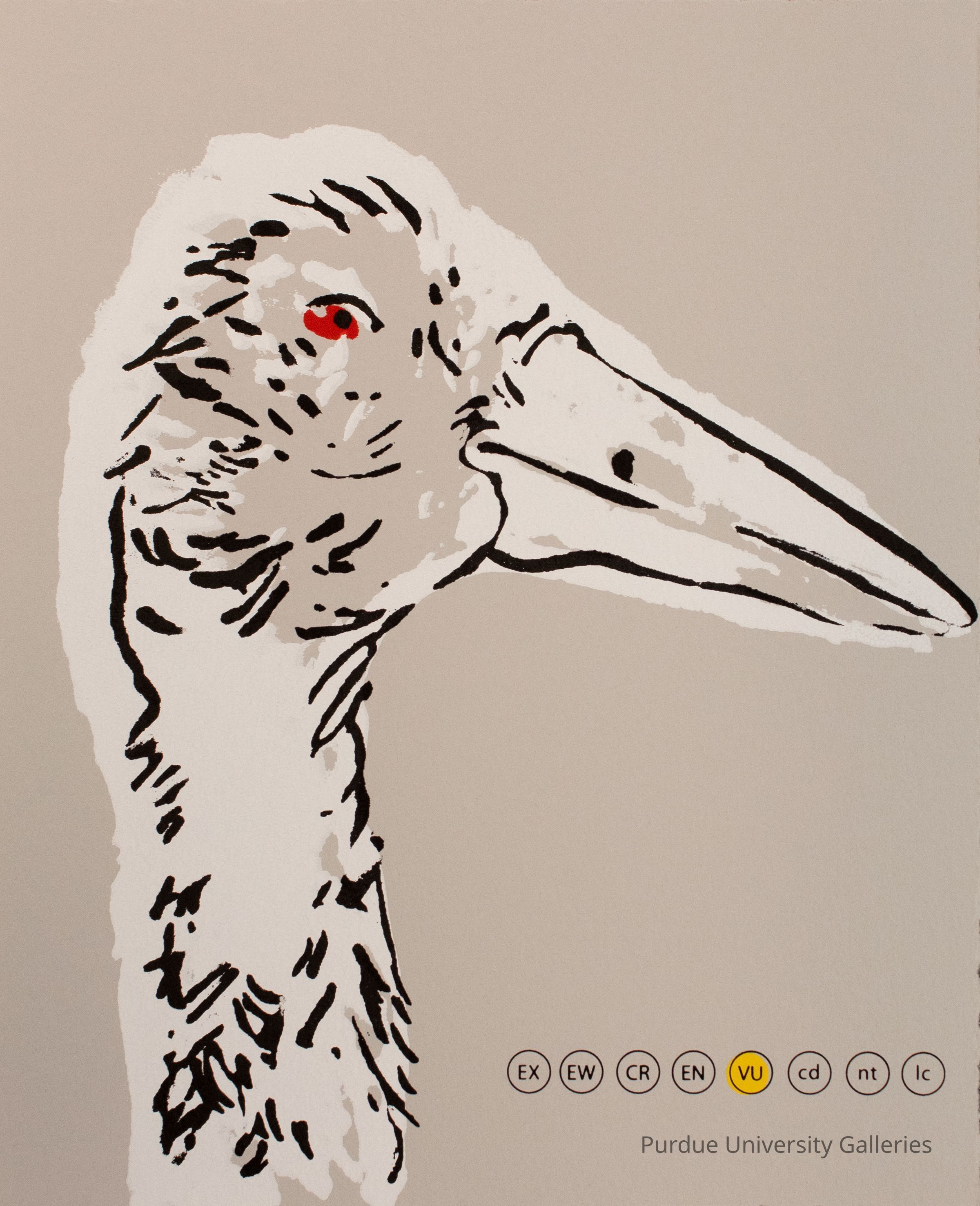 8" x 10" cardstock with gray backbround. The head and neck of a crane are stamped over most of the surface. Near the bottom are letters in cirlces: EX, EW, CR, EN, VU (shaded yellow), cd, nt, lc. On reverse side along bottom edge of cardstock written in pencil from left to right, "Hooded Crane: Vulnerable," "14/22," CatReof (???)" Under signature are white fingerprintsType of Print