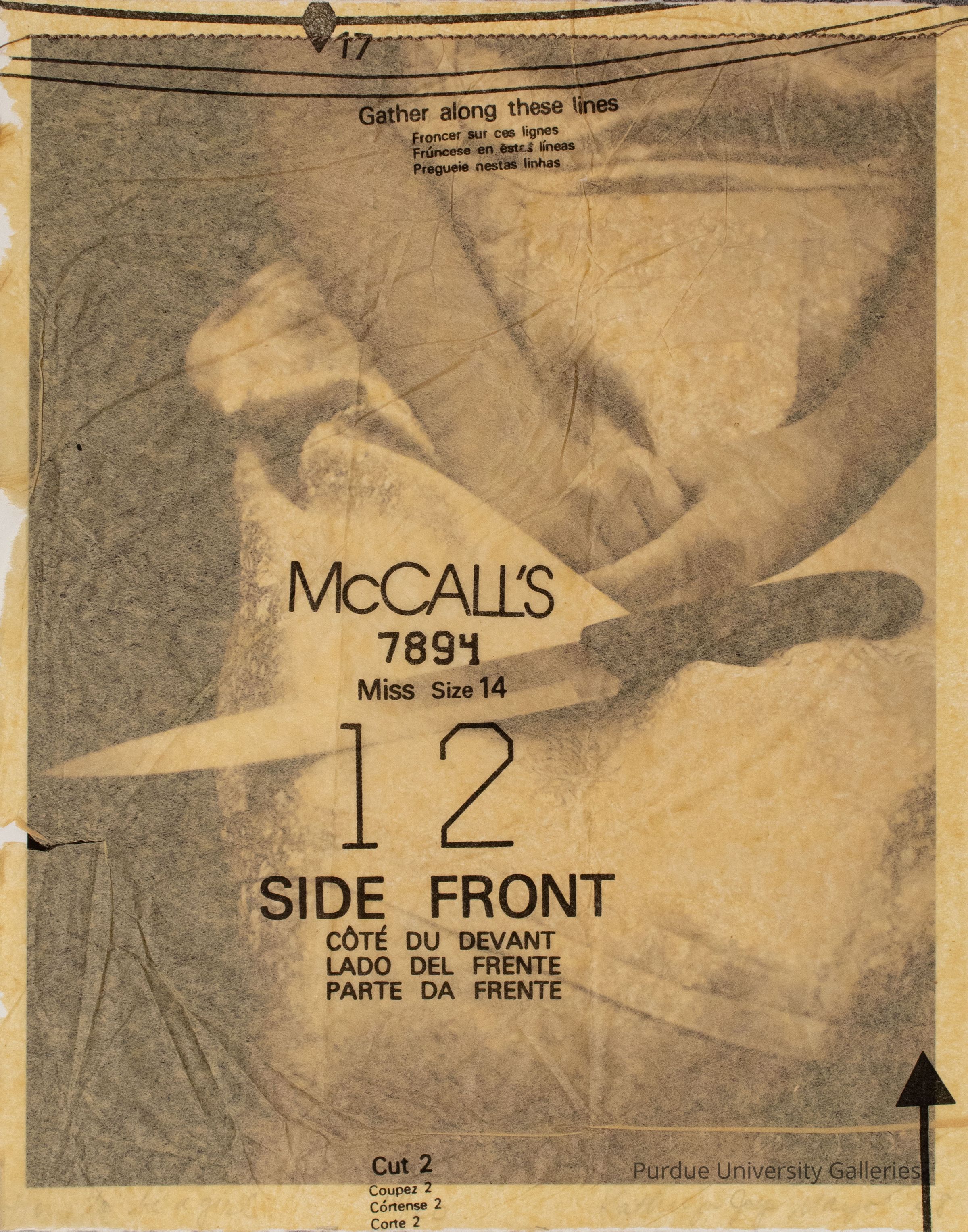 8" x 10" cardstock with print of woman in a printed dress that is sitting with her hands folded in her lap and a knife balanced across here knees. Along the edge of the cardstock written in pencil from left to right is "How to Be a Girl," "14/20," "Kathryn Joy Mayo, '08". Attached to the top fo the cardstock is an 8" x 10" tissue paper from a McCall's pattern secured by a dark thread machine stitched to the cardstock. The paper is stamped below center "McCall's, 7894, Miss Size 14, 12 (large), SIDE FRONT, COTE DU DEVANT, LADO DEL FRENTE, PARTE DA FRENTE." Below this at edge center "Cut 2, Coupes 2, Cortense 2, Corte 2." Lower, right corner is a bolded arrow pointing up. Along top of paper are two curved lines from corner to corner with instructions "Gather aong these lines, Froncer sur ces legnes, Fruncese en estas lineas, Pregueie nestas linhas." Along the top edge is bolded line with a diamond shape in the center and the number 17 next to it.Acquisition