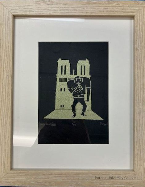 Print of man in black, outlined in gold with a Catholic church behind him in gold.Acquisition