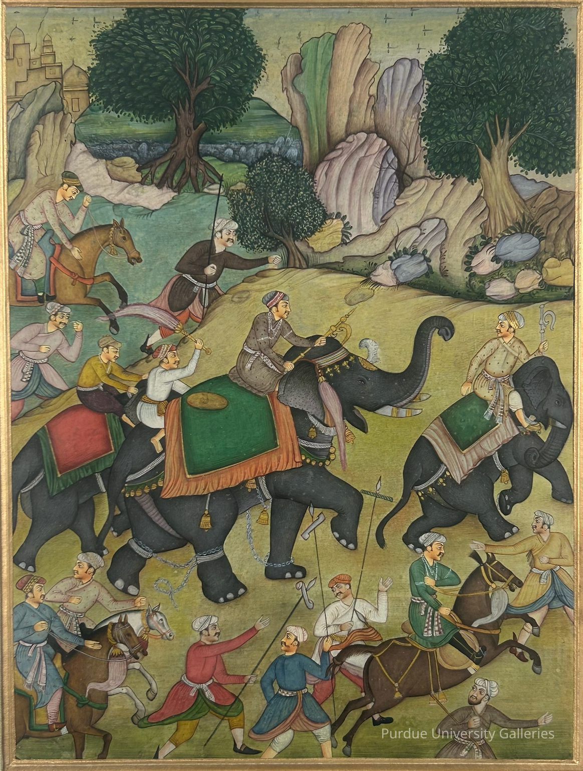In the middle zone of a landscape, a procession of black elephants with riders moves rightward, with attention focused on the largest animal in the center, framed by smaller elephants in front and behind. All three animals are draped with colorful cloths, and the central elephant has chains around its legs and attached bells. Its princely rider is finely dressed and is adorned with a string of pearls around his neck, as he uses a goad or metal hook (ankus) to drive his elephant. A servant astride the animal's rump fans his master with a feathery plume, and all of the elephant riders wear a rounded cap or turban that bulges behind. Above and below the main group appear attendants on horseback and on foot, the latter carrying long, pointed staffs. The landscape recedes toward a rolling, colored terrain punctuated with trees, and in the upper left can be seen a distant castle.