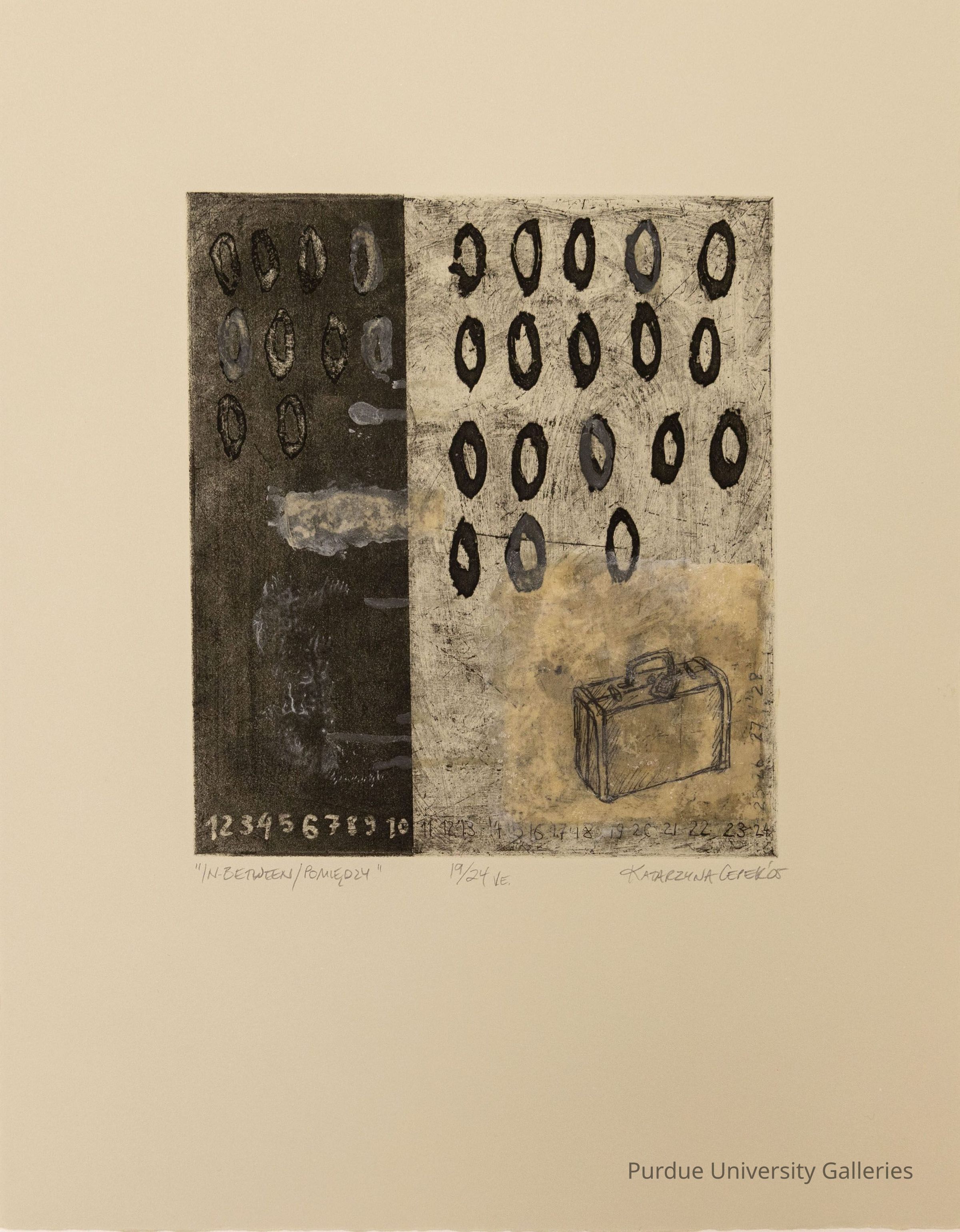 Etching of a square with black on the 1/3 left side and gray on the 2/3 right side. Both sides have circles or zeroes across the top (10 on the left and 18 on the right). in the bottom right hand corner of the right hand side is a drawing of a suitcase. Along the length of the bottom of the print are numbers running from 1 to 24. Below the print is written in pencil "In=between/Pomiedozy, 19/24 ve, Katarzyna Cepek"Type of Print